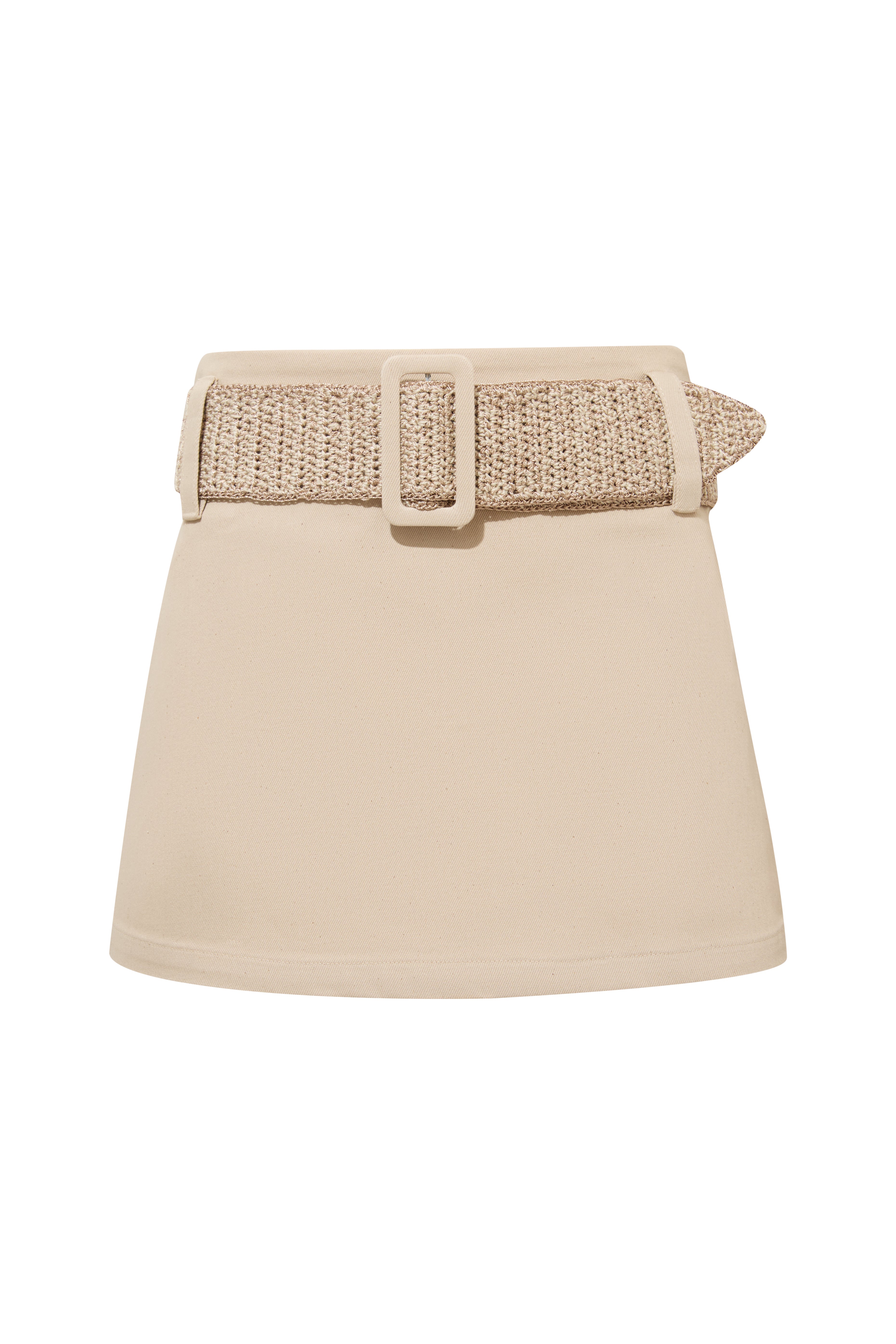 A chic mini skirt that balances simplicity with handcrafted detail. It features a hand-knitted wide belt at the waist that adds texture and definition. Pairs beautifully with our coordinating top or crochet pieces from the collection, and transitions effortlessly when styled with timeless basics like a crisp white shirt.