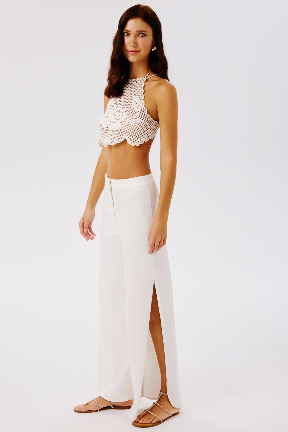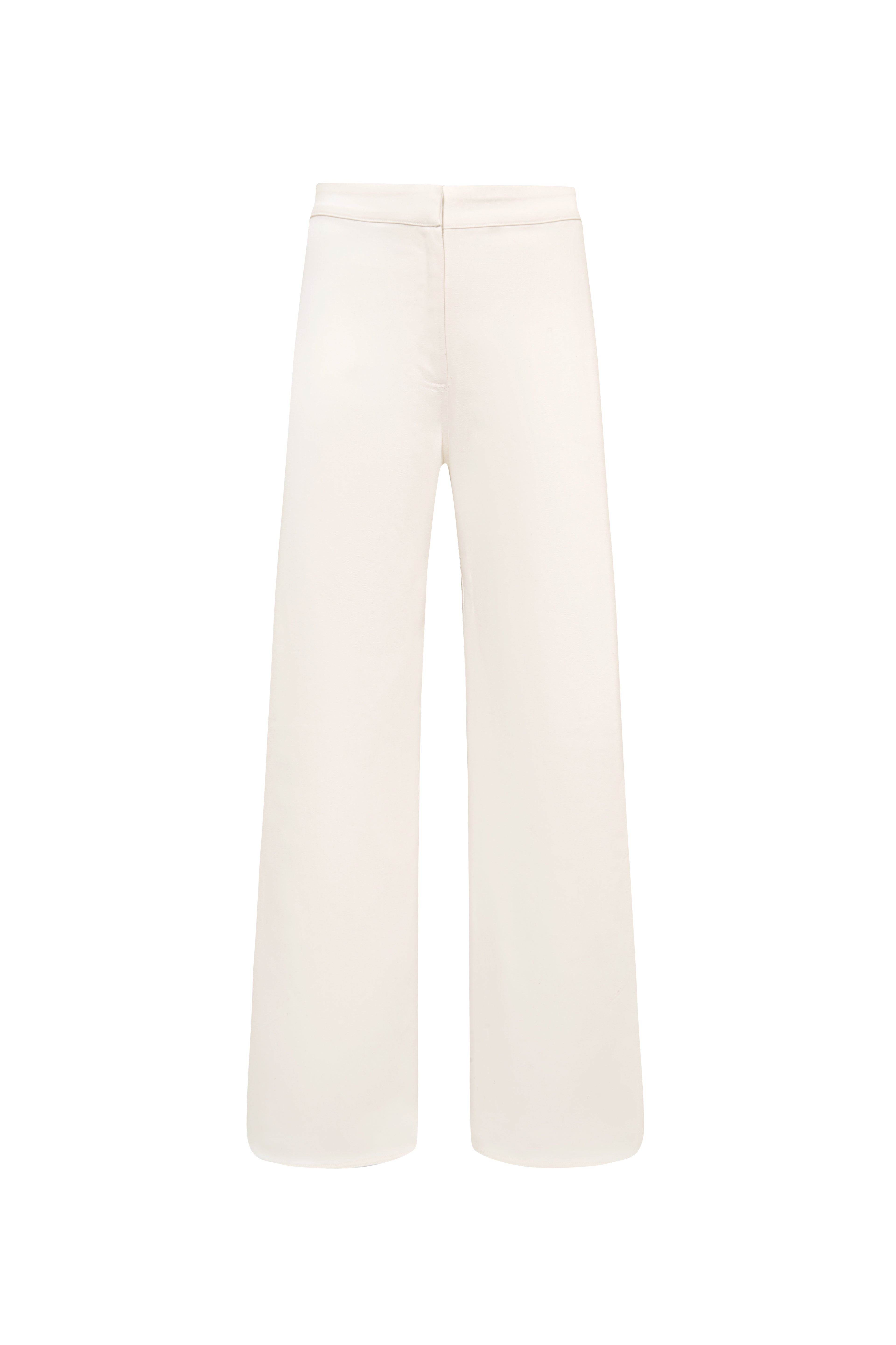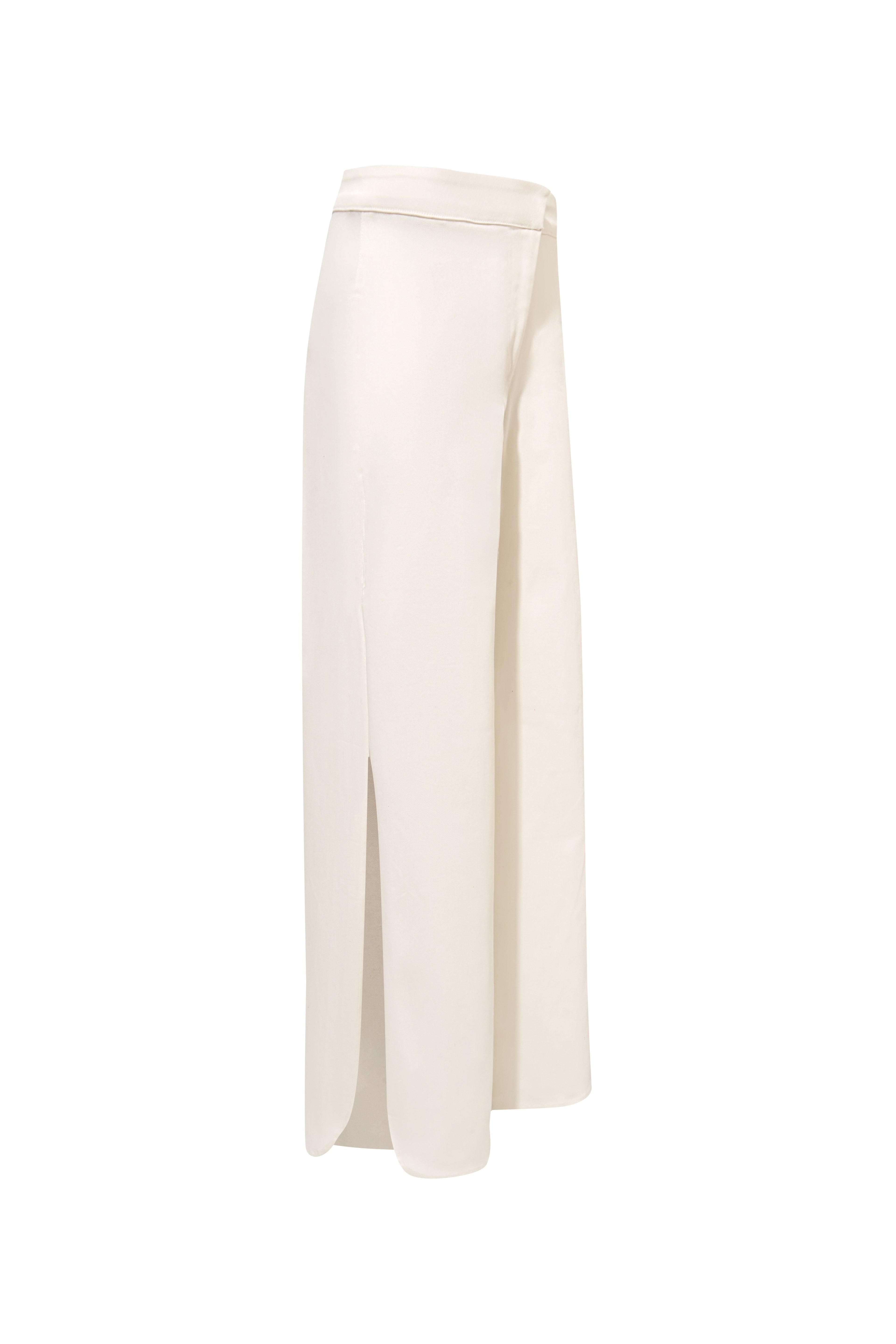 A tailored pant with a refined retro edge. Designed with side slits shaped in soft oval curves, this style features a front placket with an inner metallic hook closure for a clean finish.