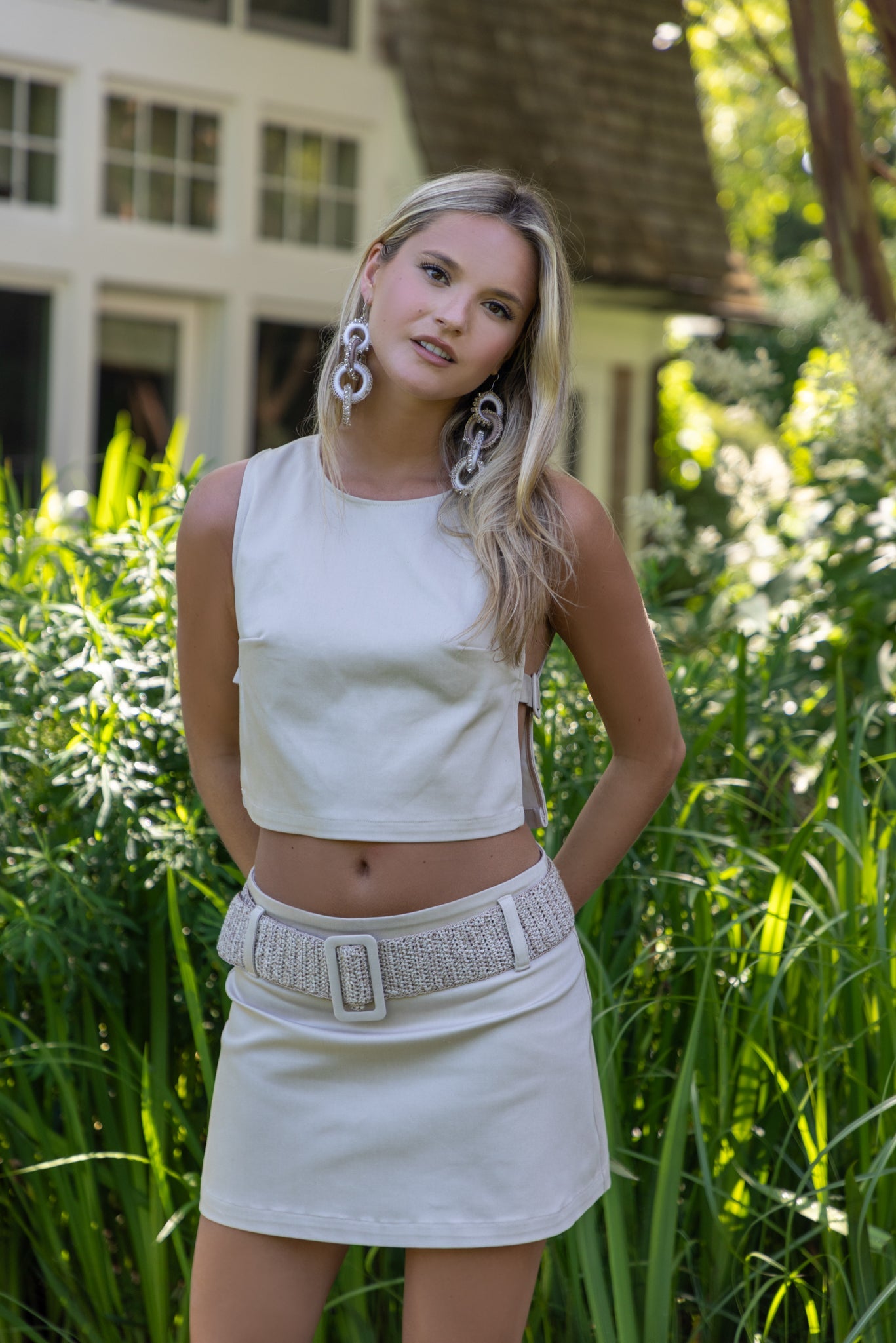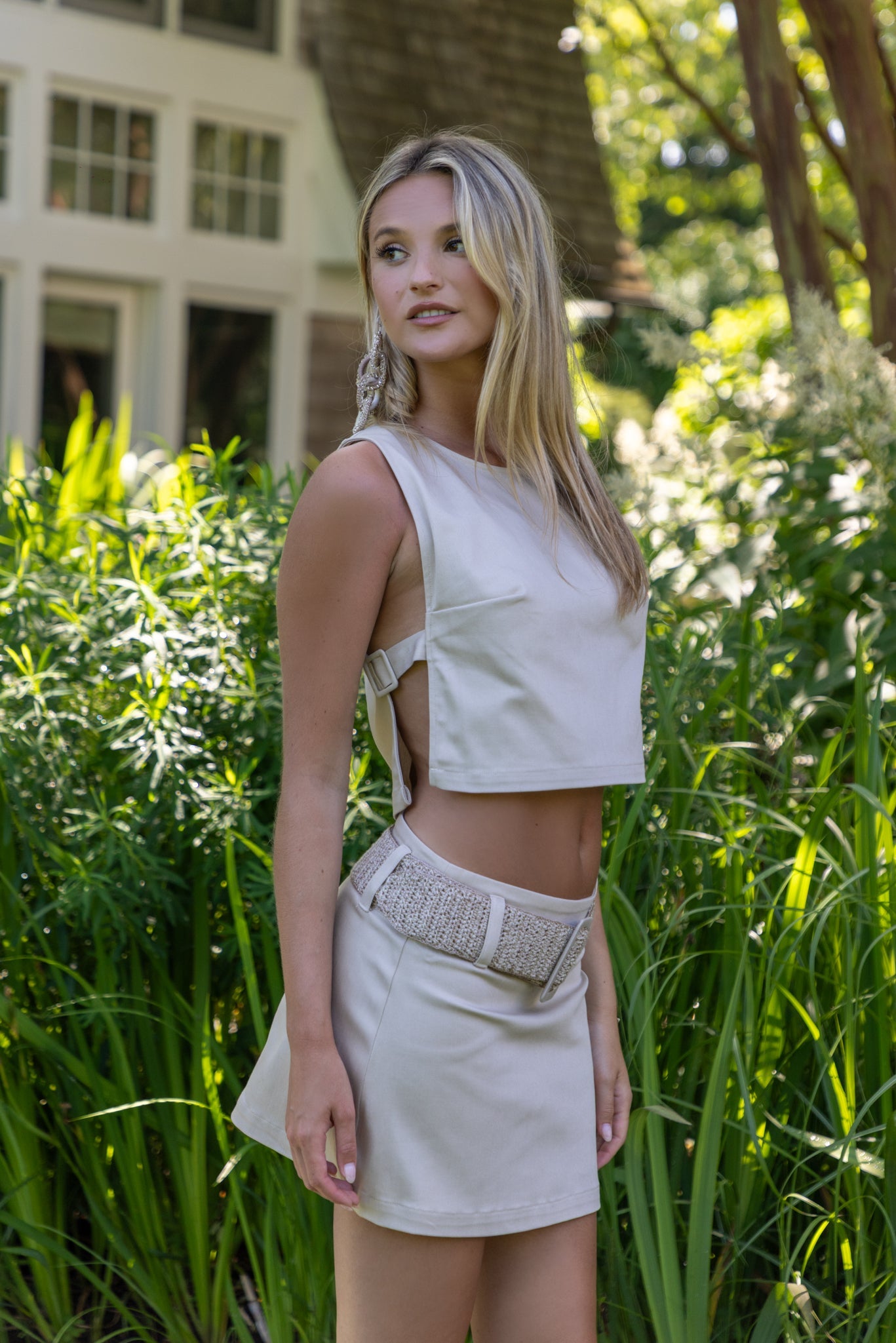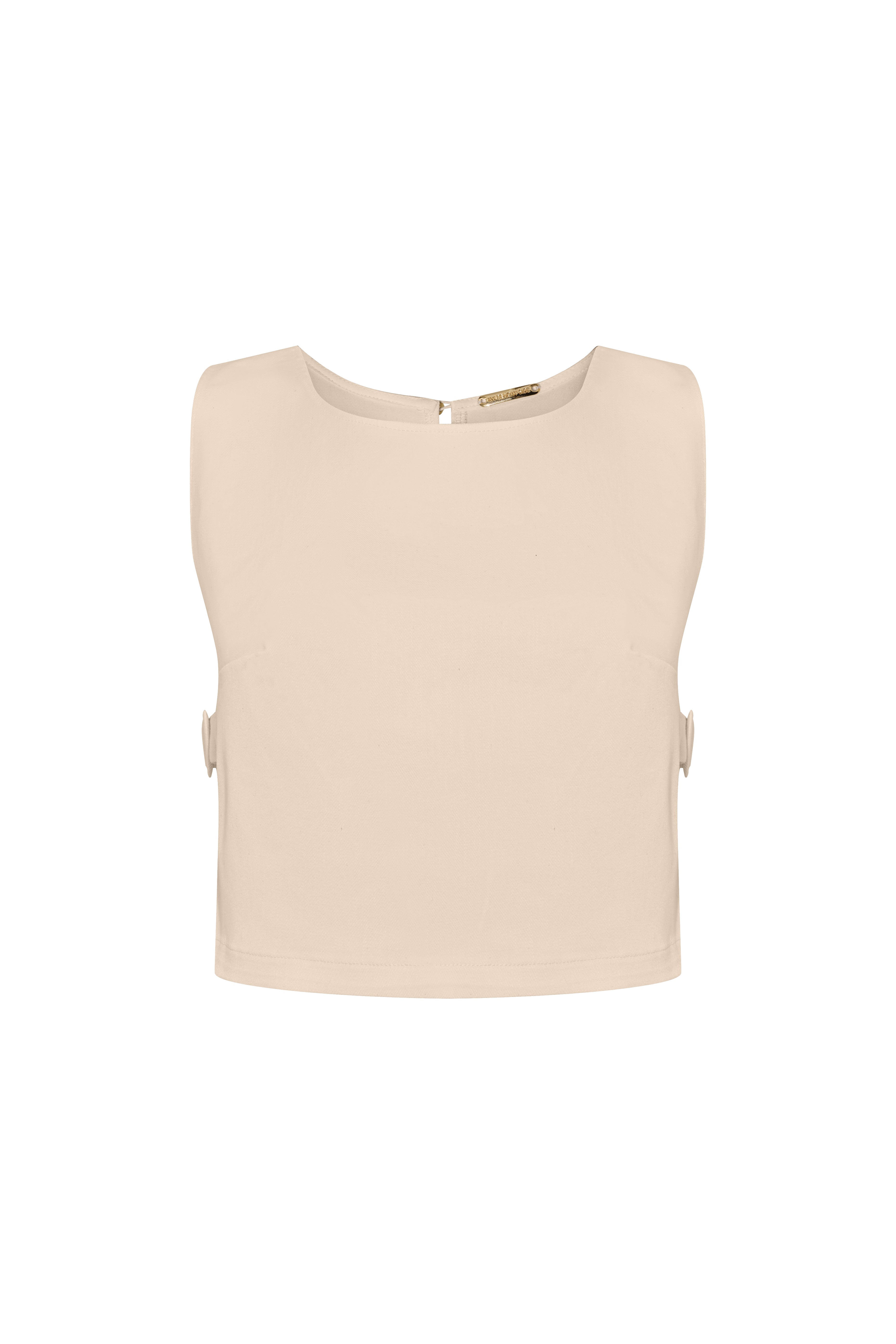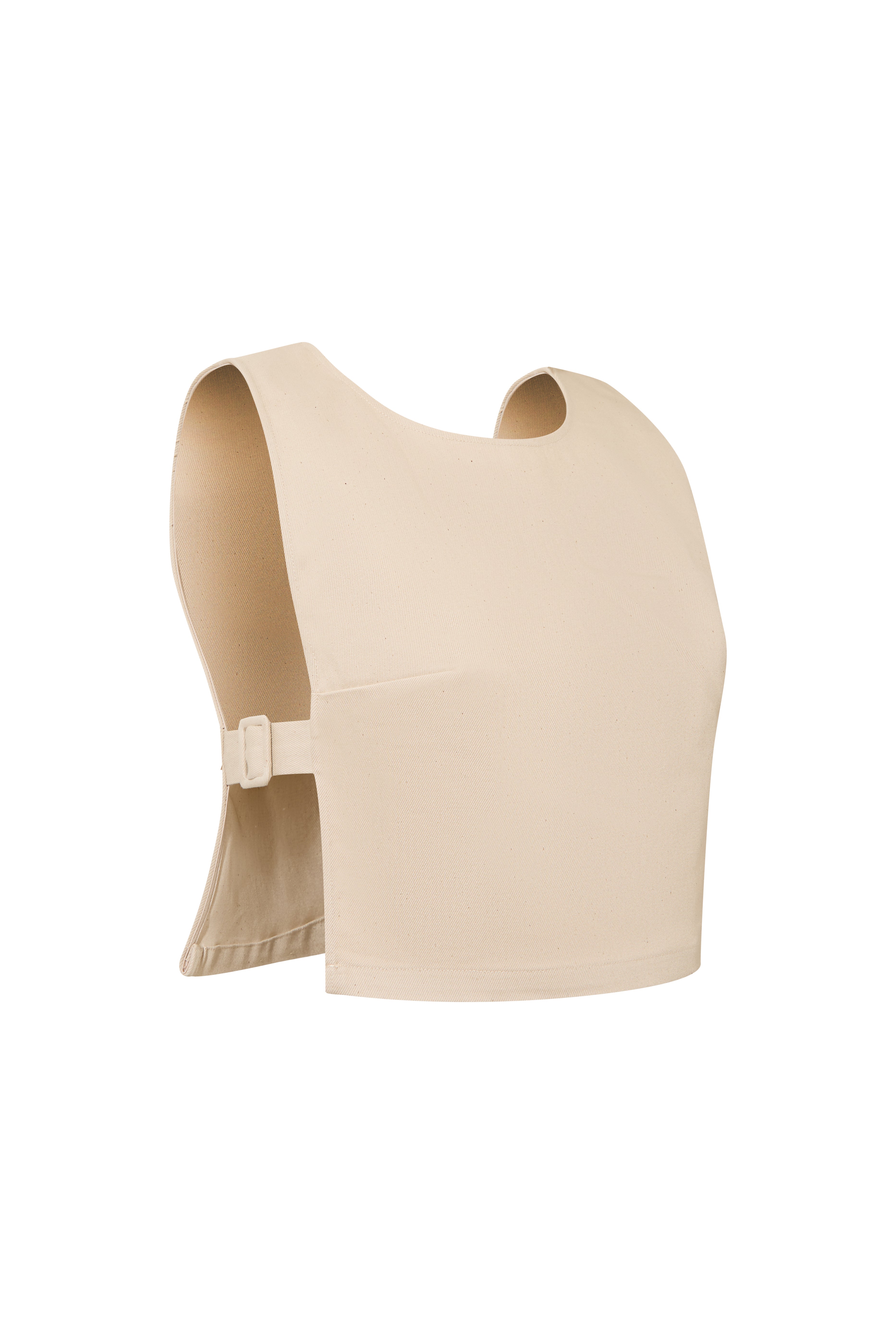 A contemporary denim top defined by clean lines and unexpected details. Designed with open sides, it features belt-inspired side bands with buckle accents that reveal subtle glimpses of the body. This piece combines structure and ease in a refined summer silhouette.