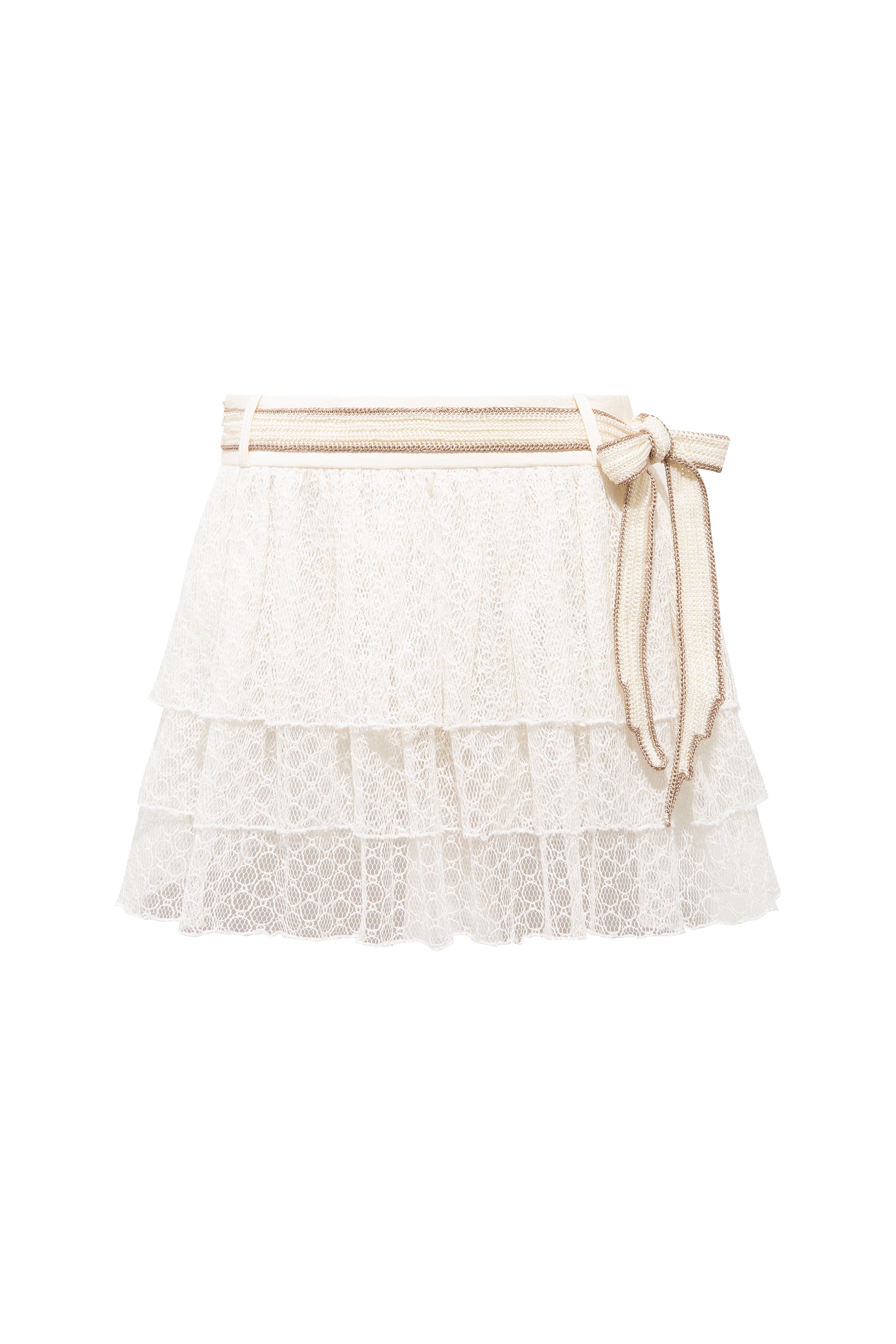 A playful ruffled mini skirt crafted from three layers of delicate lace. This piece blends texture and elegance for a charming, feminine touch. Perfect for pairing with tops or blouses for a romantic summer look.