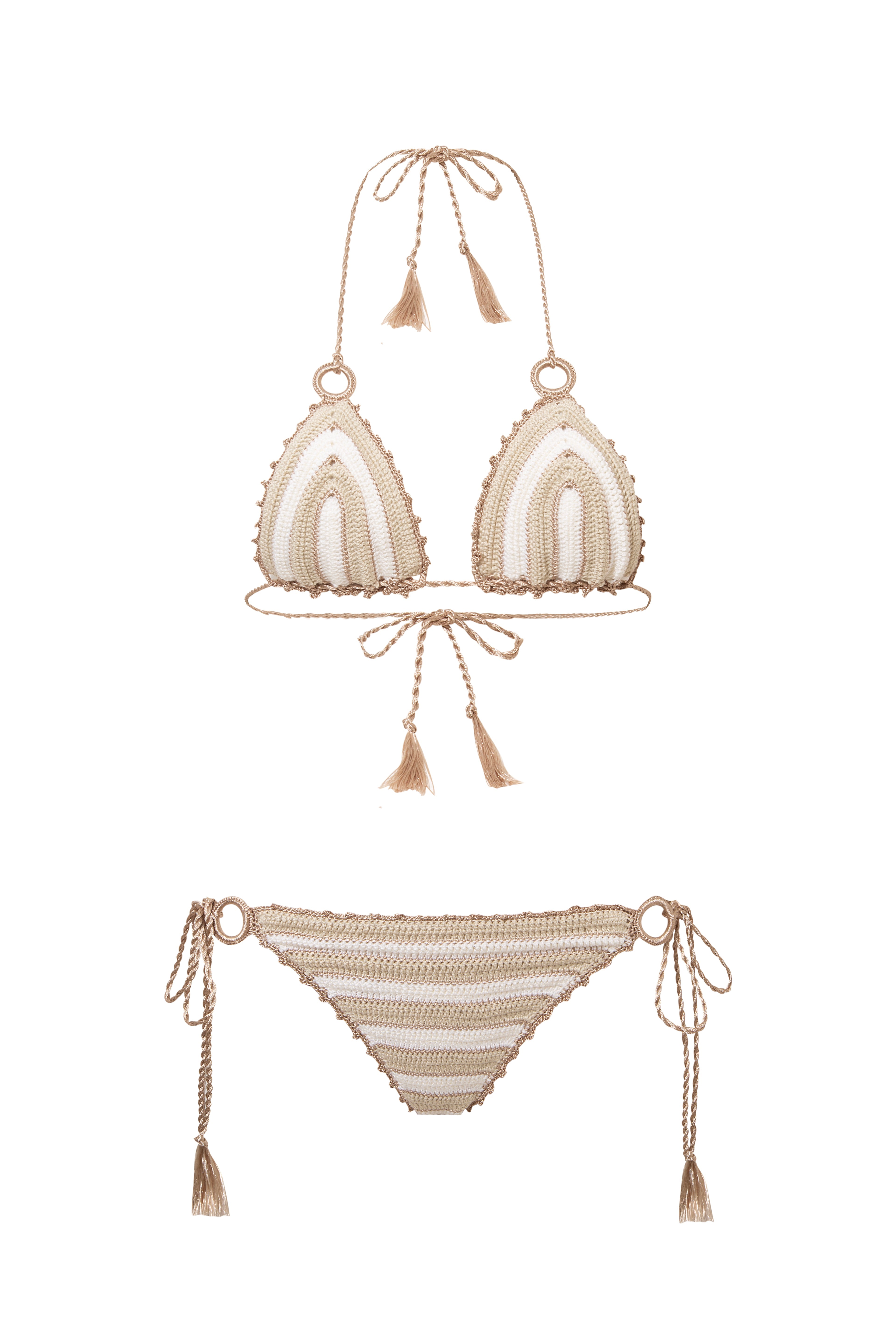 Set sail for summer with our stunning triangle bikini set, inspired by retro nautical silhouettes. Crafted from soft, durable yarns, this exquisite piece features a classic blue and white striped design, beautifully complemented by vibrant stone yarn contours that add a playful pop of color.