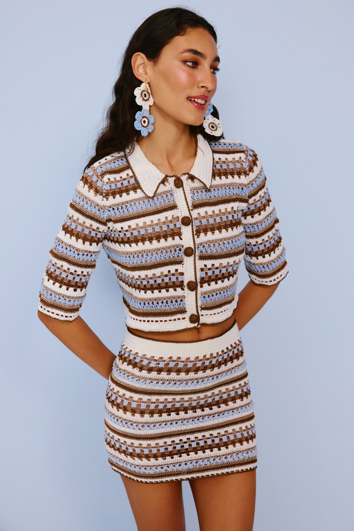 Crafted with artisanal care, this cardigan showcases intricate crochet artistry in a vibrant, playful design. Adorned with a unique combination of varied motifs, it is crocheted with colorful threads that bring striped texture. The elasticized waist ensures a flattering fit, making it a perfect piece to transition effortlessly from day to night.