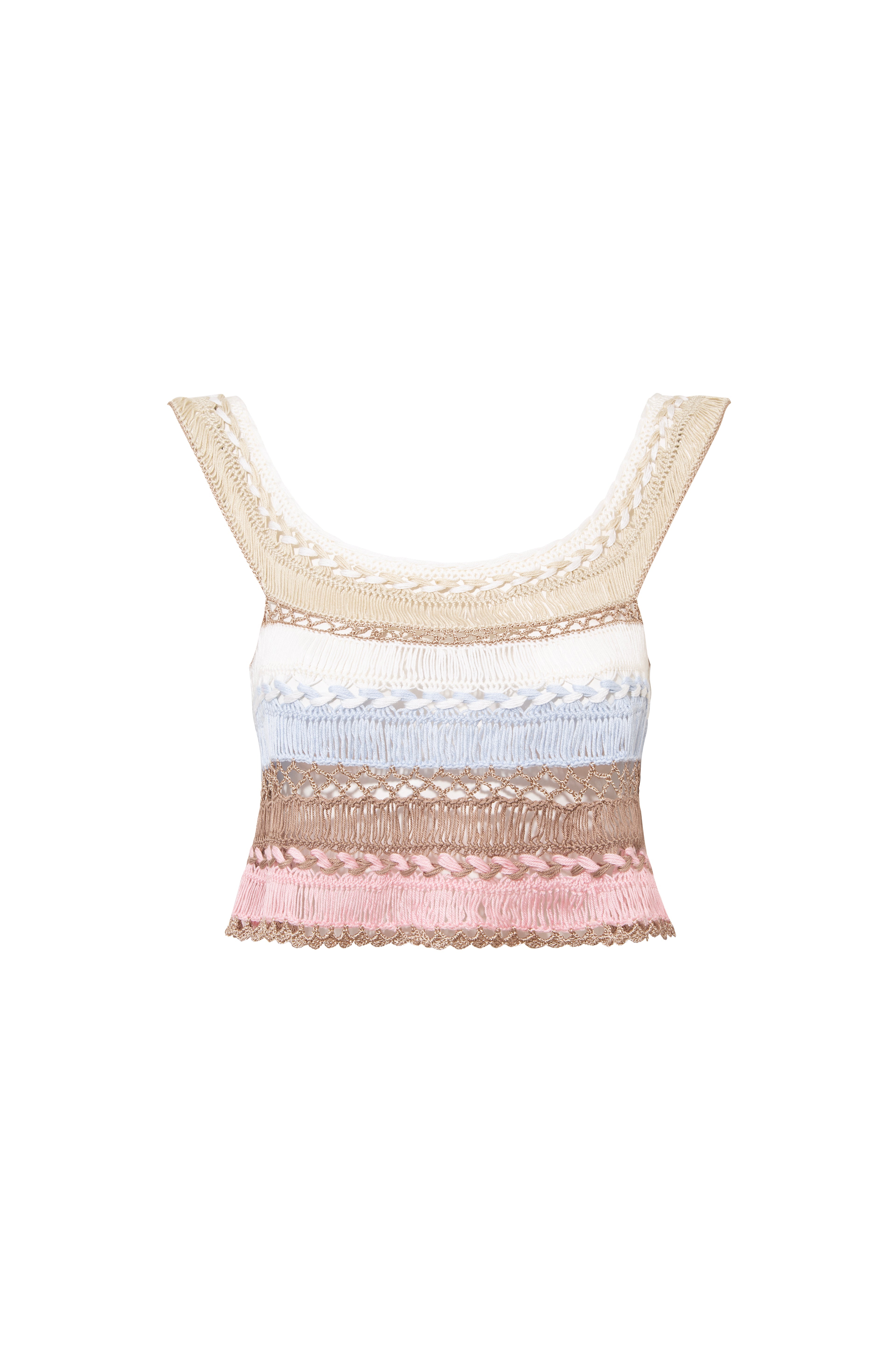 A charming handcrafted crochet square-neck top, designed to complement a variety of looks with effortless elegance. Featuring a subtle sequin-accented motif detailing, it brings a playful sparkle to a timeless silhouette. Light and breathable, this versatile piece can be styled alone or paired with matching skirts for a coordinated set that shines day or night.