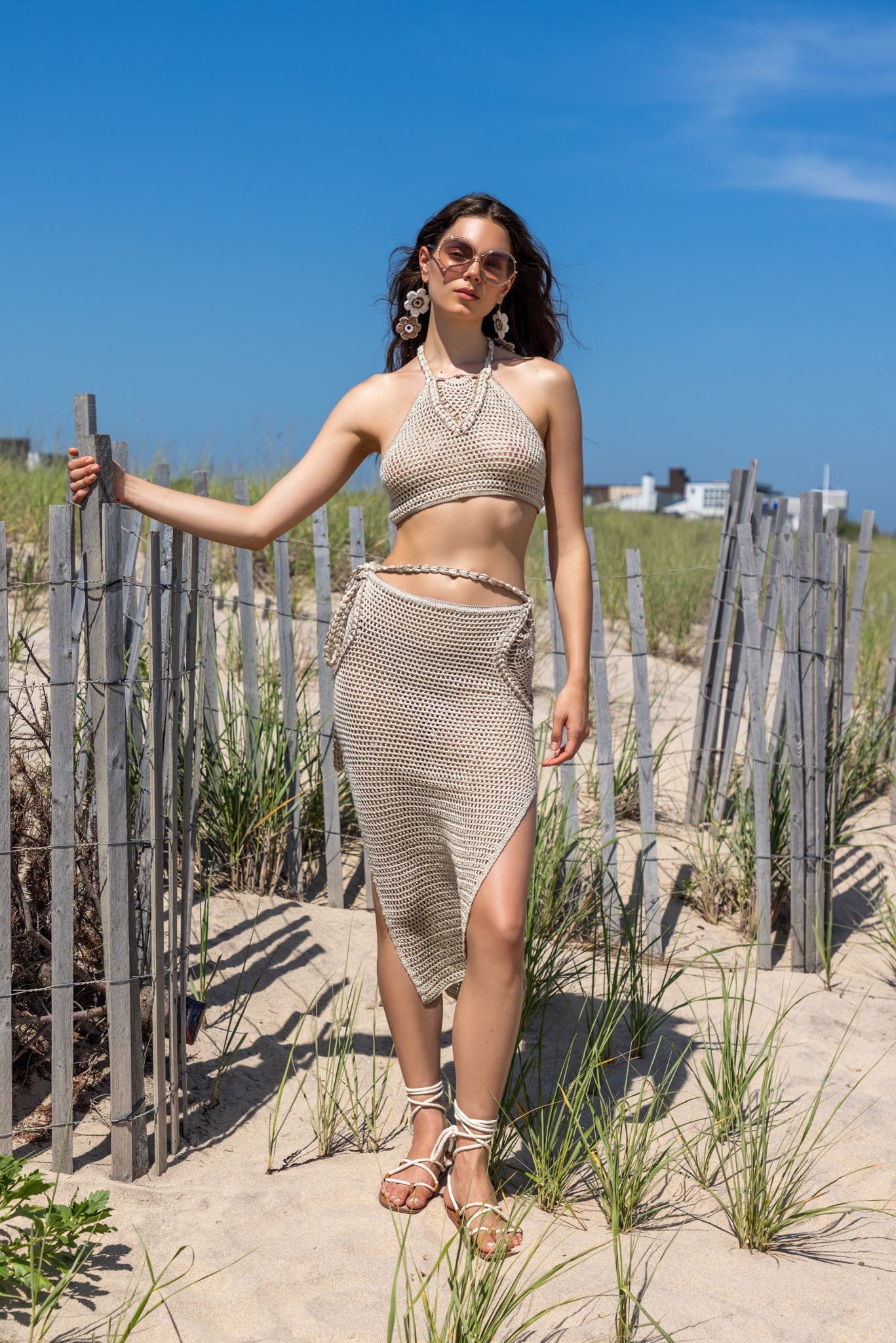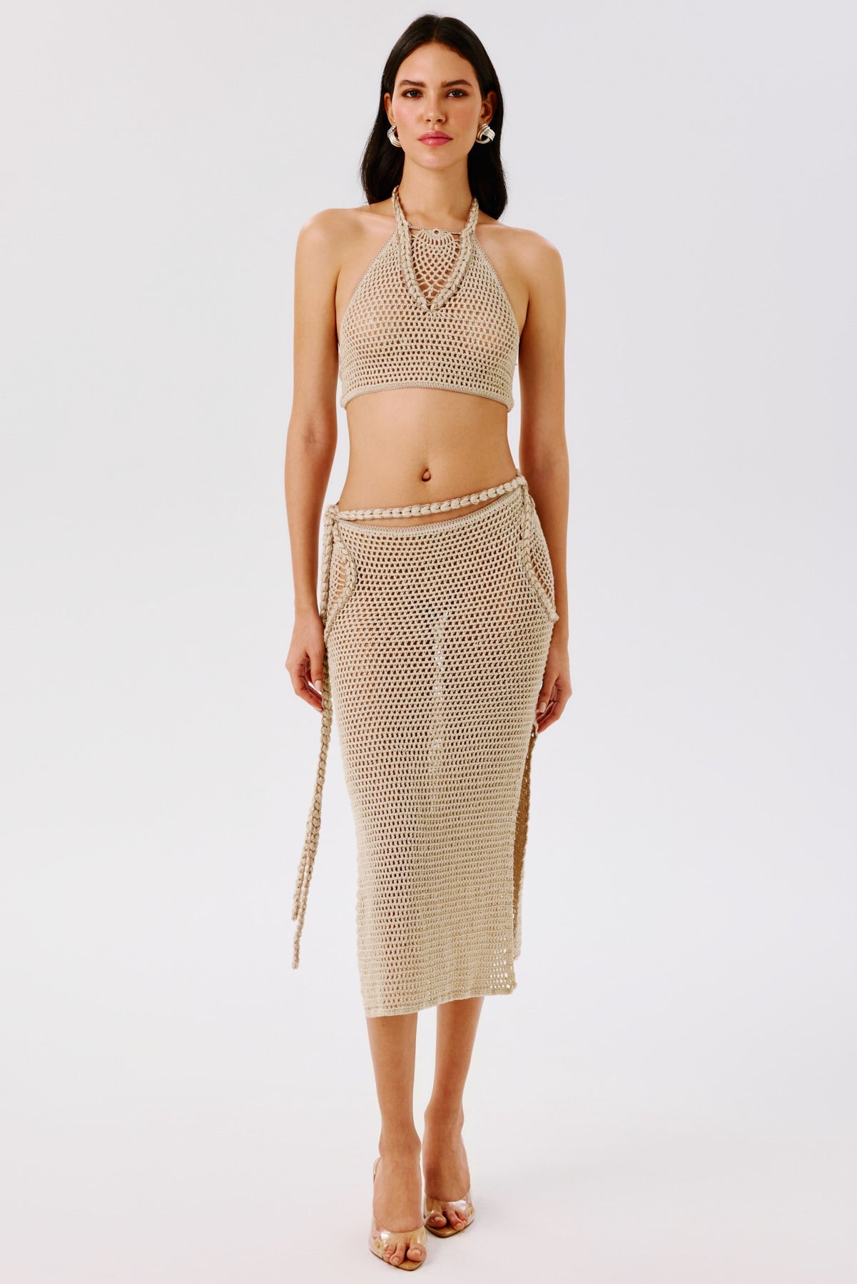 A handcrafted crochet midi skirt designed with intricate side motifs and adjustable ties for a personalized fit. Beautifully versatile, it can be styled seamlessly with the matching halter top or worn separately for effortless summer elegance.