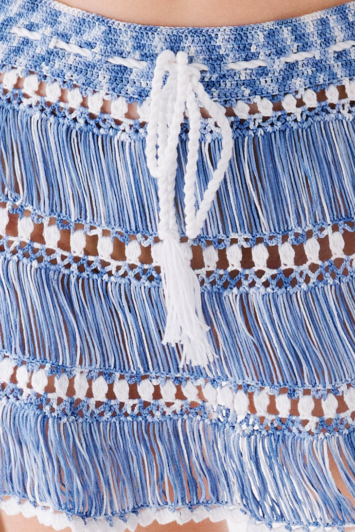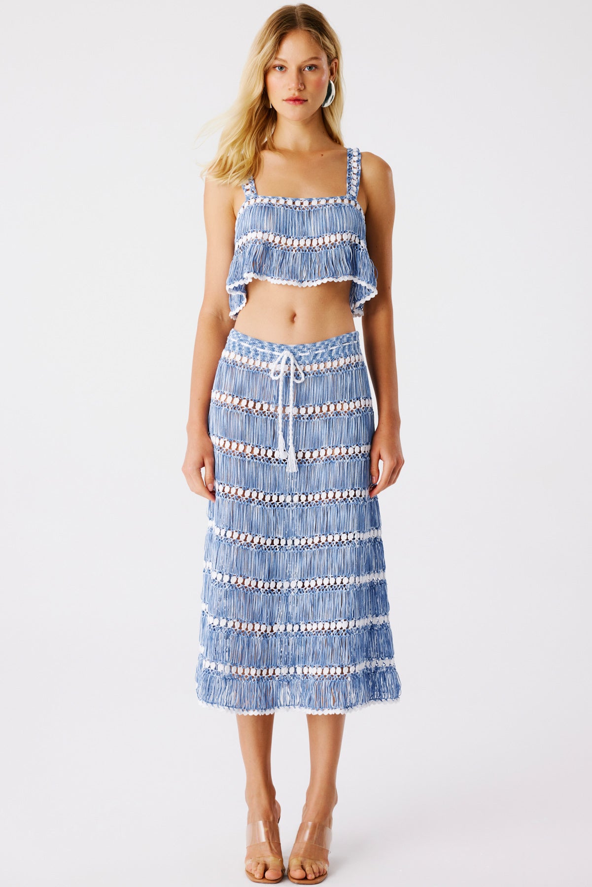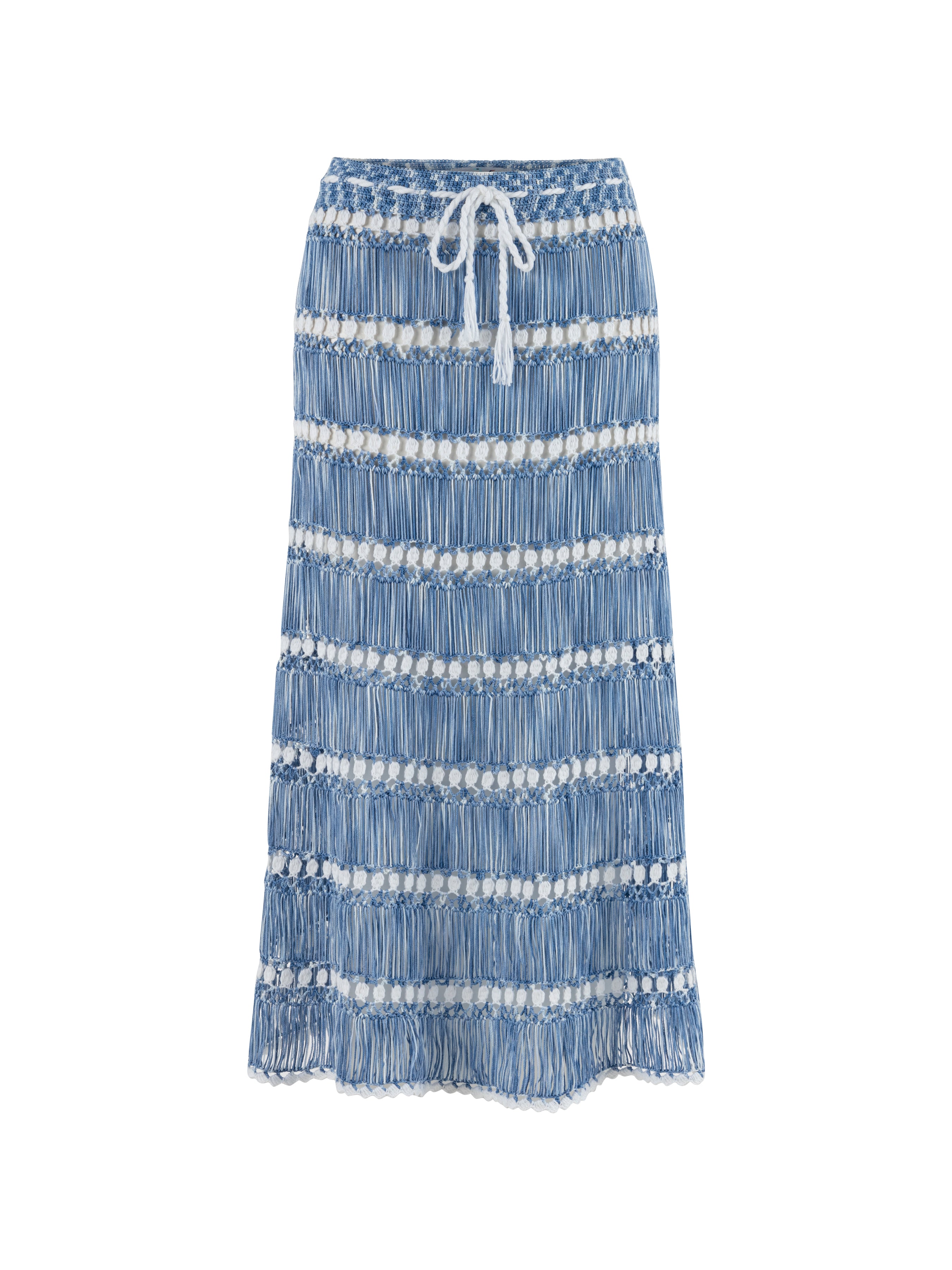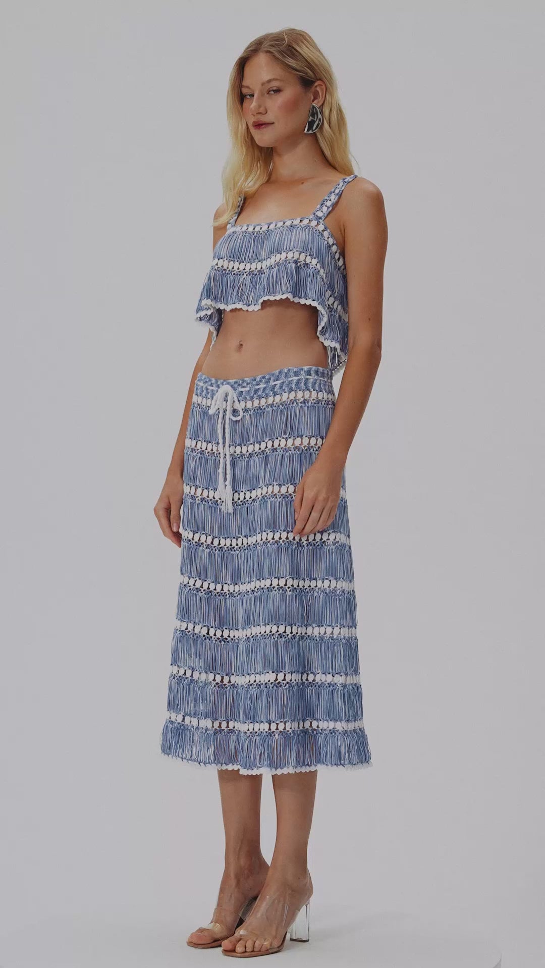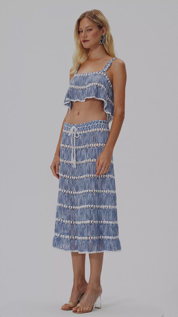 A crochet midi skirt, inspired by the timeless essence of denim. This beautifully crafted piece features exquisite hand crochet detailing, showcasing the artistry and care that goes into each design. With a comfortable drawstring waist, it offers a customizable fit, ensuring you feel as good as you look. Pair it effortlessly with its coordinating top for a chic, put-together look, or style it with a casual tee for a laid-back day out. Elevate your summer wardrobe with this artisanal piece that seamlessly blends comfort, style, and elegance.