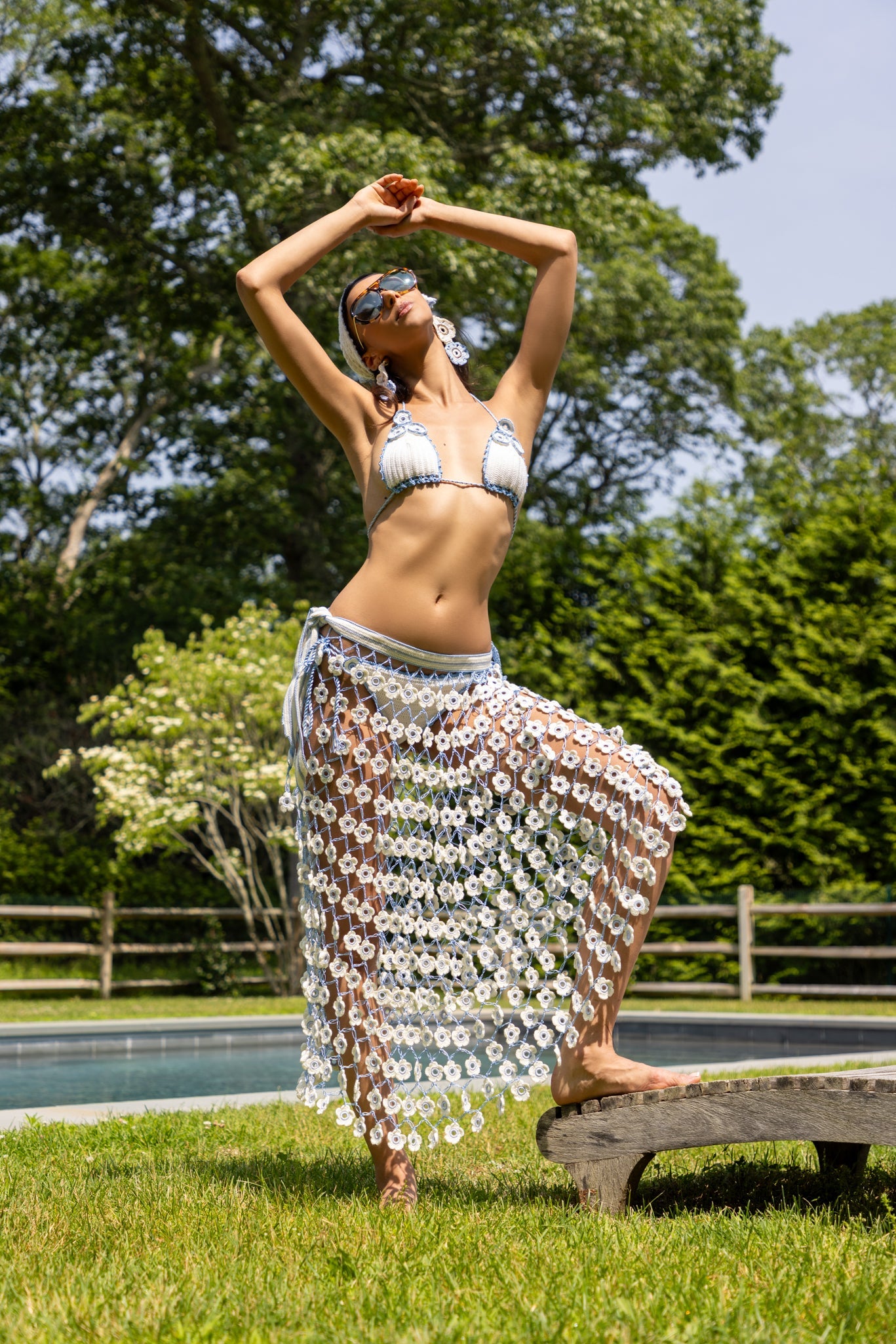 Our signature crochet maxi skirt, a beautifully versatile piece that can also be worn as an enchanting dress, is now adorned with romantic floral motifs. Carefully handcrafted by our skilled, fairly compensated artisans, this design blends sustainable luxury with timeless charm. The intricate floral detailing adds a soft, garden-inspired elegance, while the adjustable tie waist offers a comfortable one-size-fits-most fit. Perfect for pairing with your favorite swimwear or elevating your look for an evening affair, this maxi skirt is an essential for effortless, refined style.
