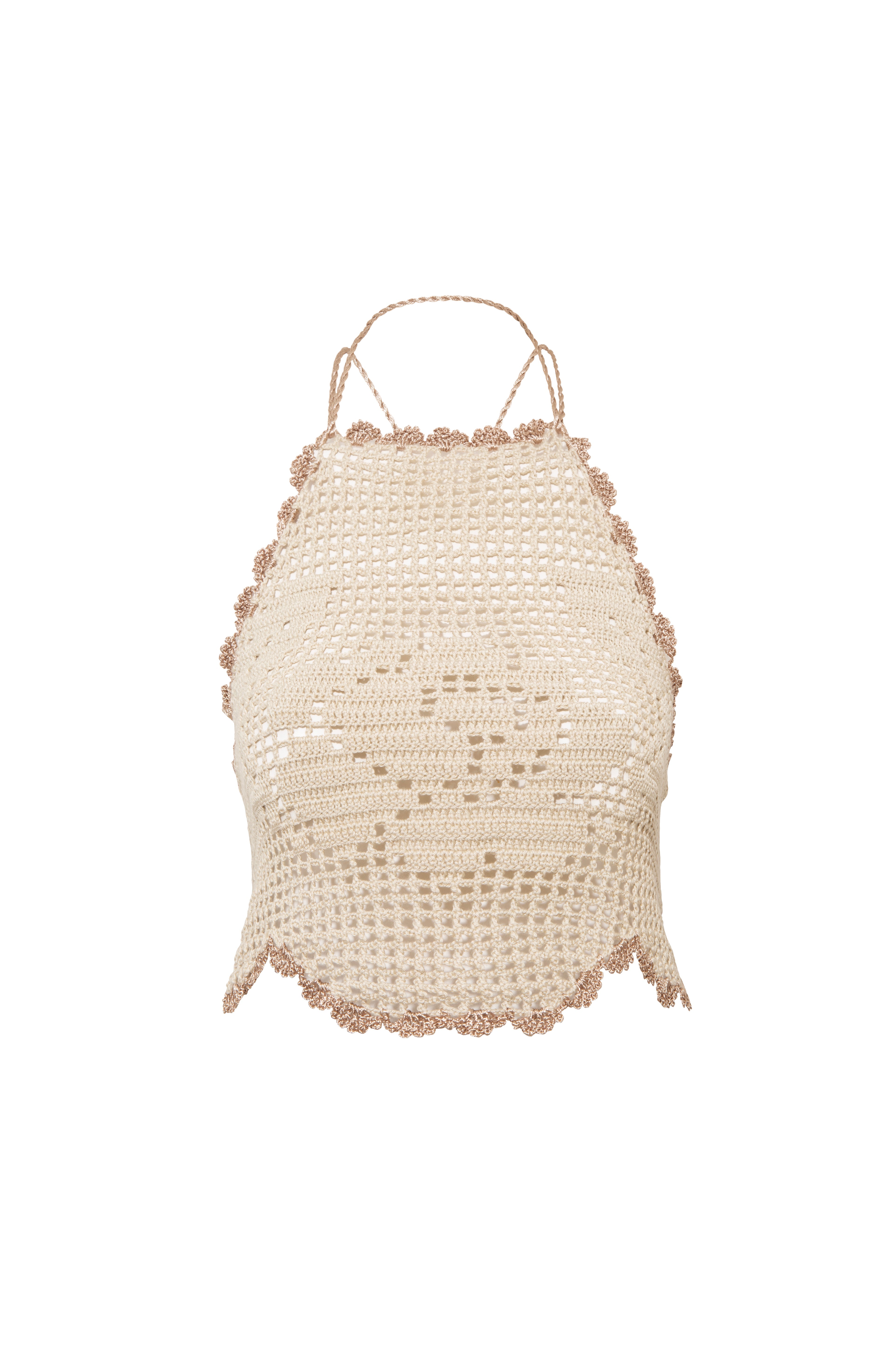 A graceful handcrafted crochet halter top that blends artisanal charm with romantic detailing. Featuring delicate straps and a feminine rose motiff at the hem, it brings a soft, lace-like elegance to the silhouette. Perfectly designed to complement the matching skirt or to stand alone as a chic summer piece.