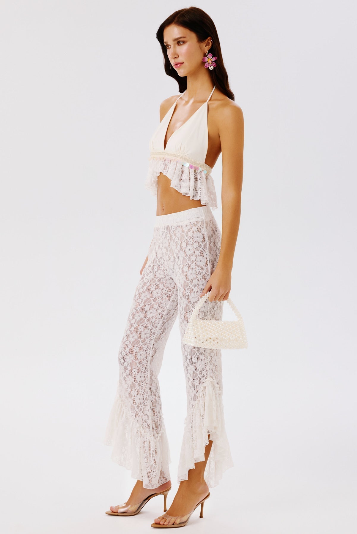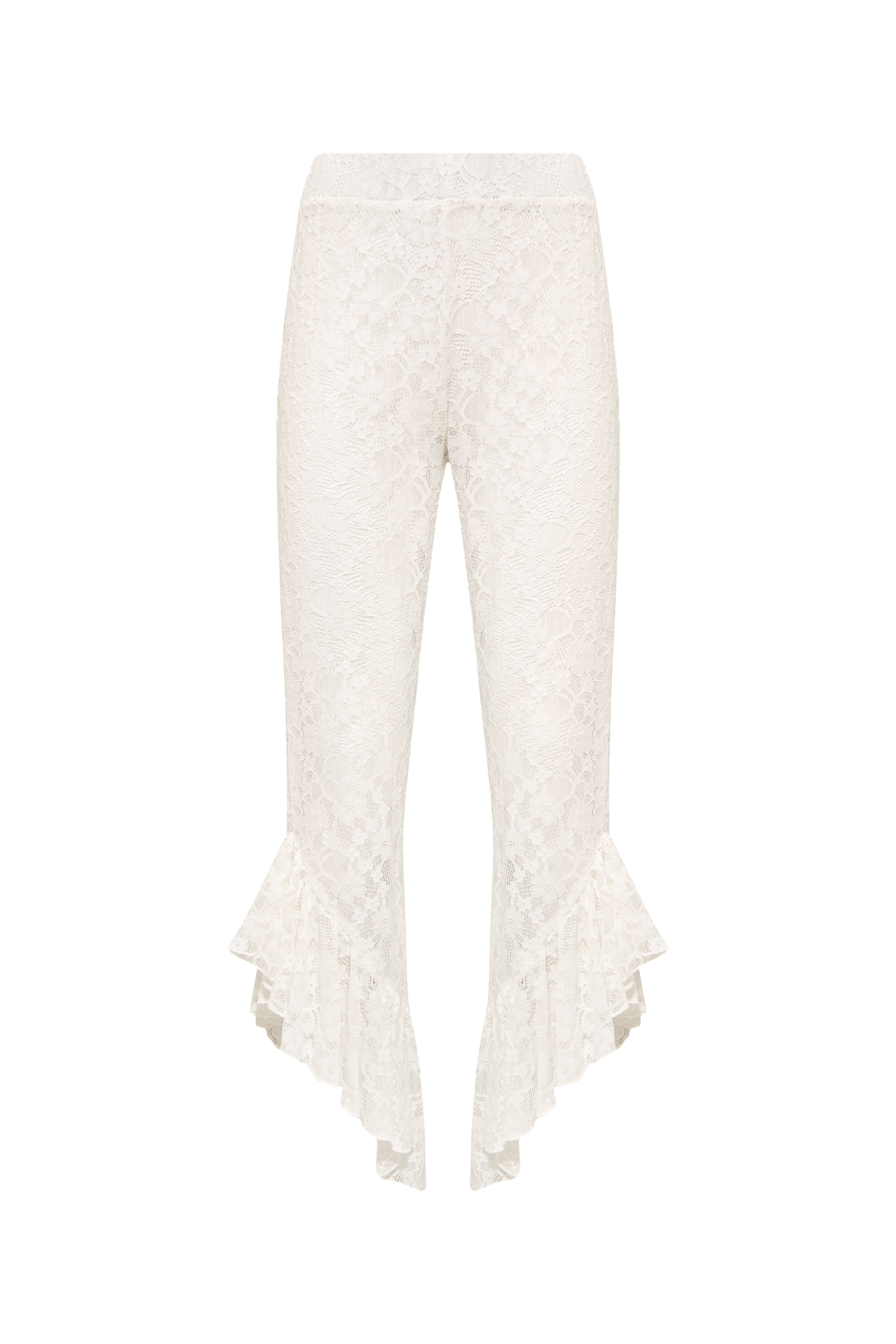 A refined lace pant that captures effortless summer sophistication. Designed with a waistband for comfort and a flattering, body-hugging fit, it flows into asymmetrical ruffled hems for a graceful finish. Perfect for evening occasions or elevated daytime styling.