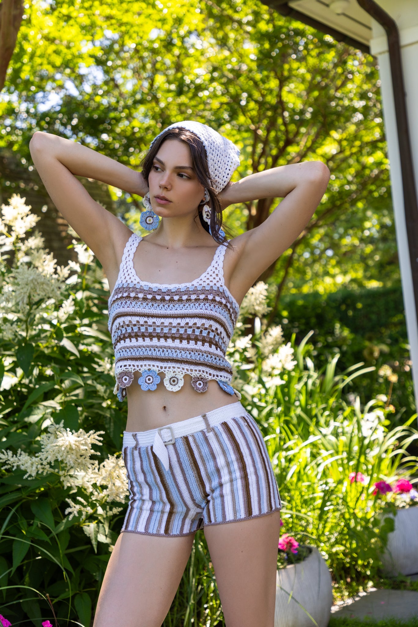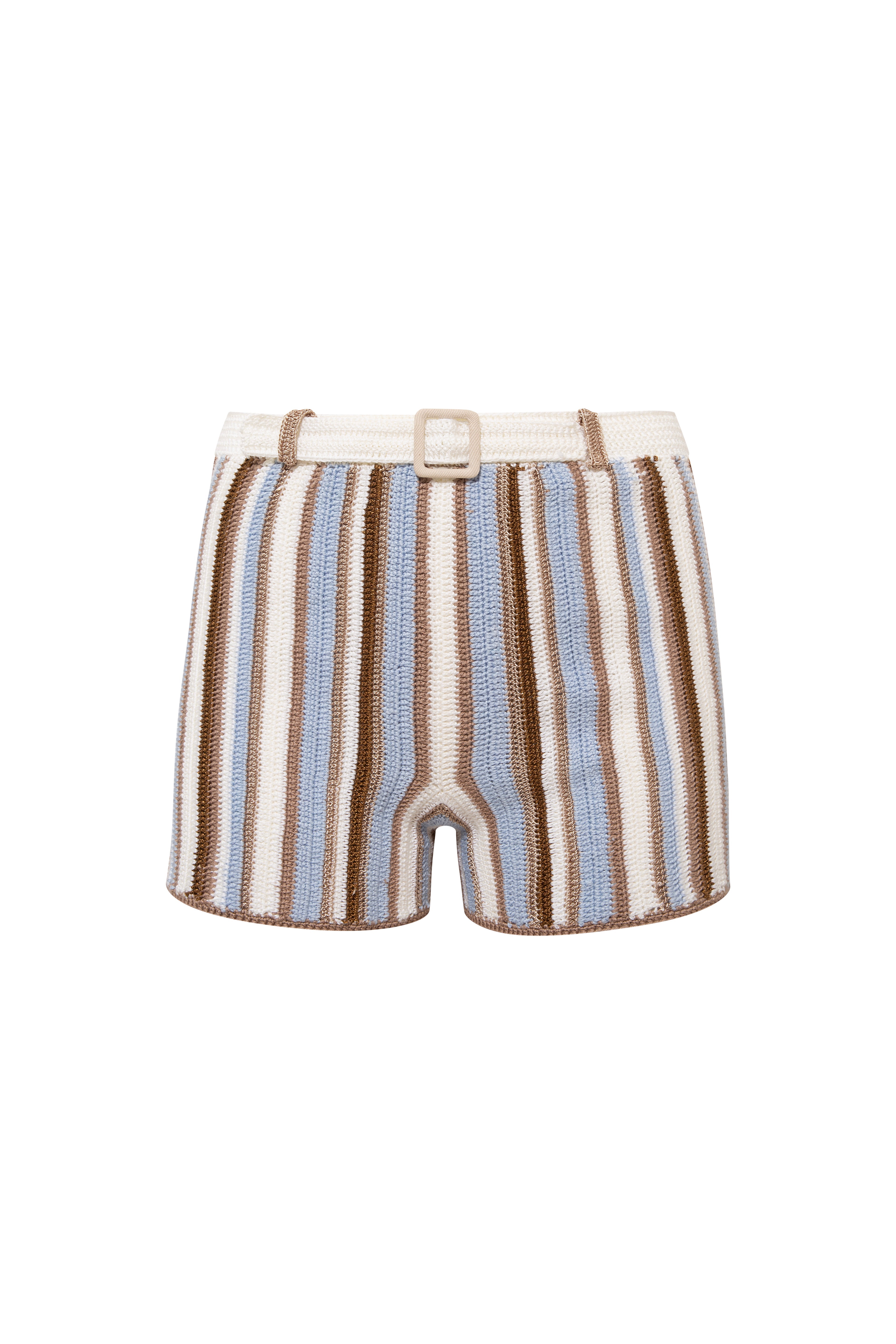 Crafted with a distinctive crochet technique, this striped retro knit short blends artisanal detail with modern style. Featuring a decorative belt-like design at the front complete with a buckle, it adds a unique statement to any outfit. Perfectly styled with its matching top or worn independently for a chic, versatile look.