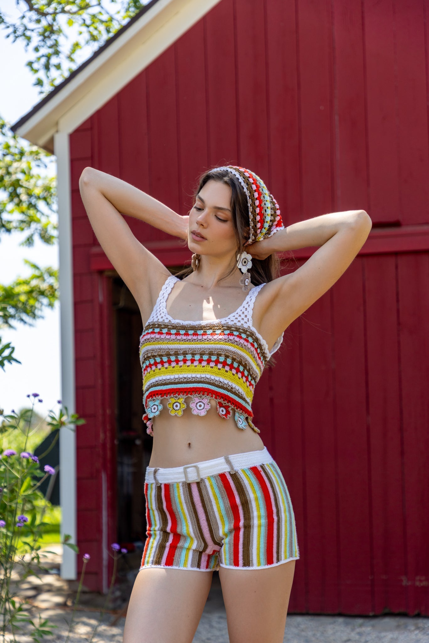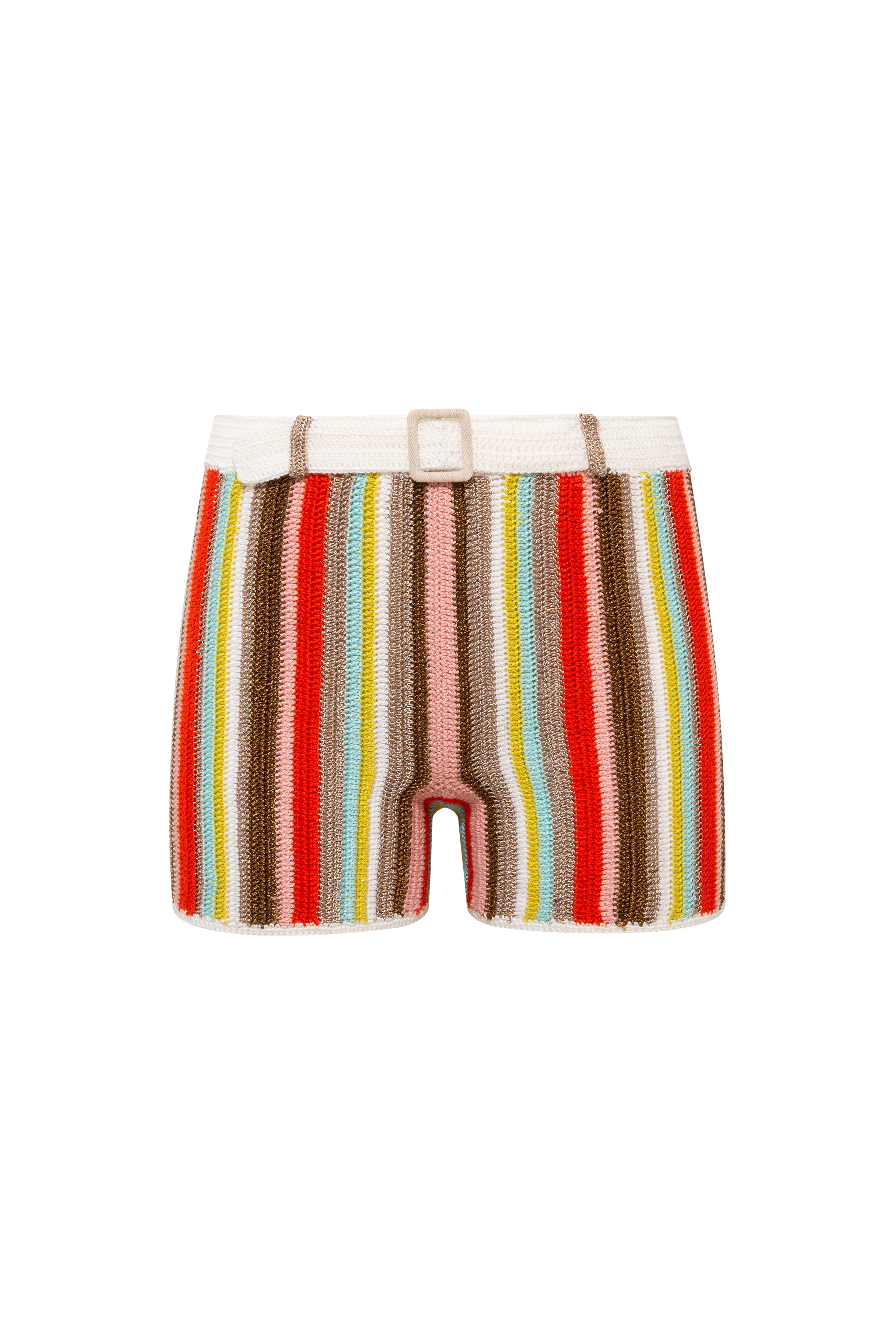Crafted with a distinctive crochet technique, this striped retro knit short blends artisanal detail with modern style. Featuring a decorative belt-like design at the front complete with a buckle, it adds a unique statement to any outfit. Perfectly styled with its matching top or worn independently for a chic, versatile look.