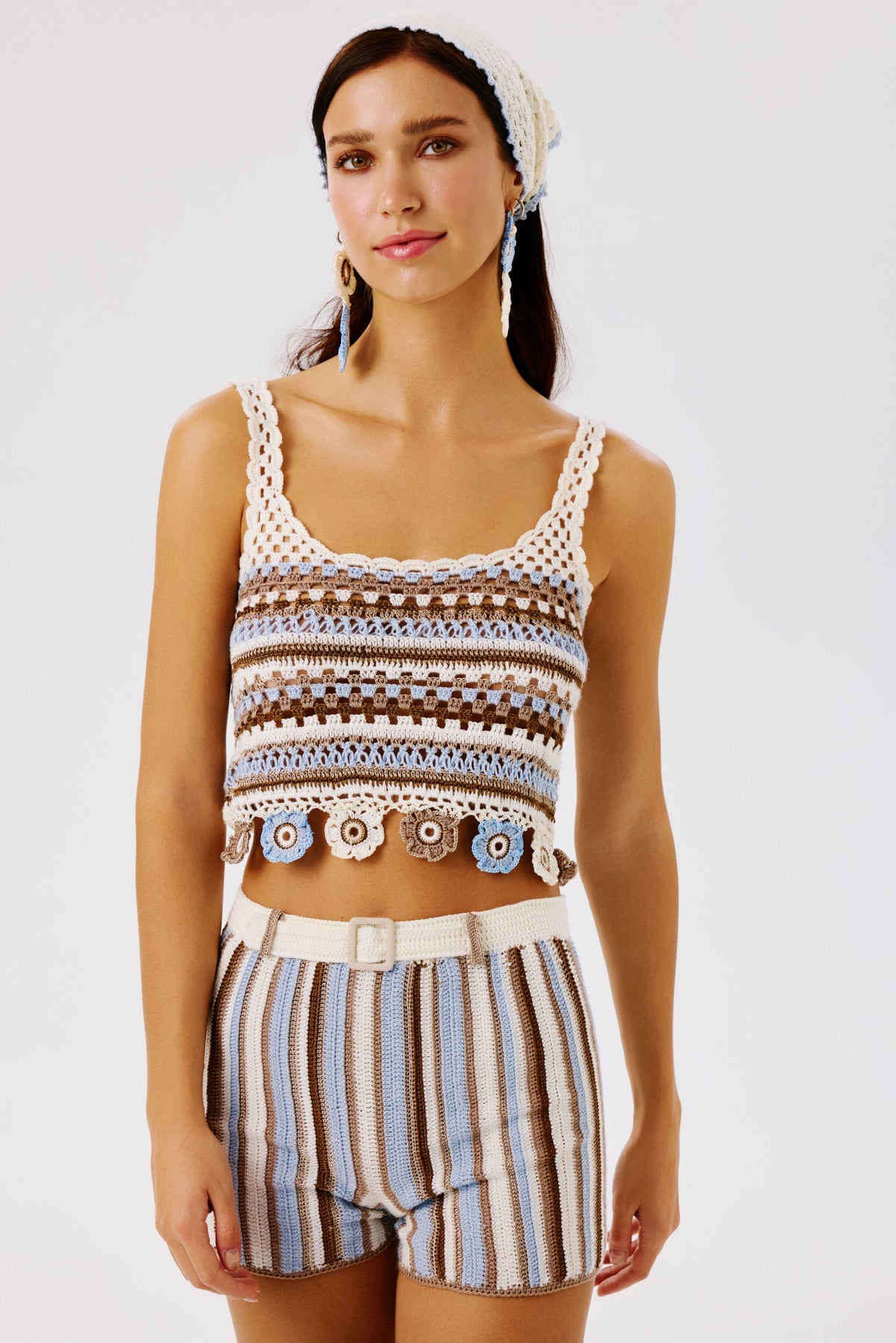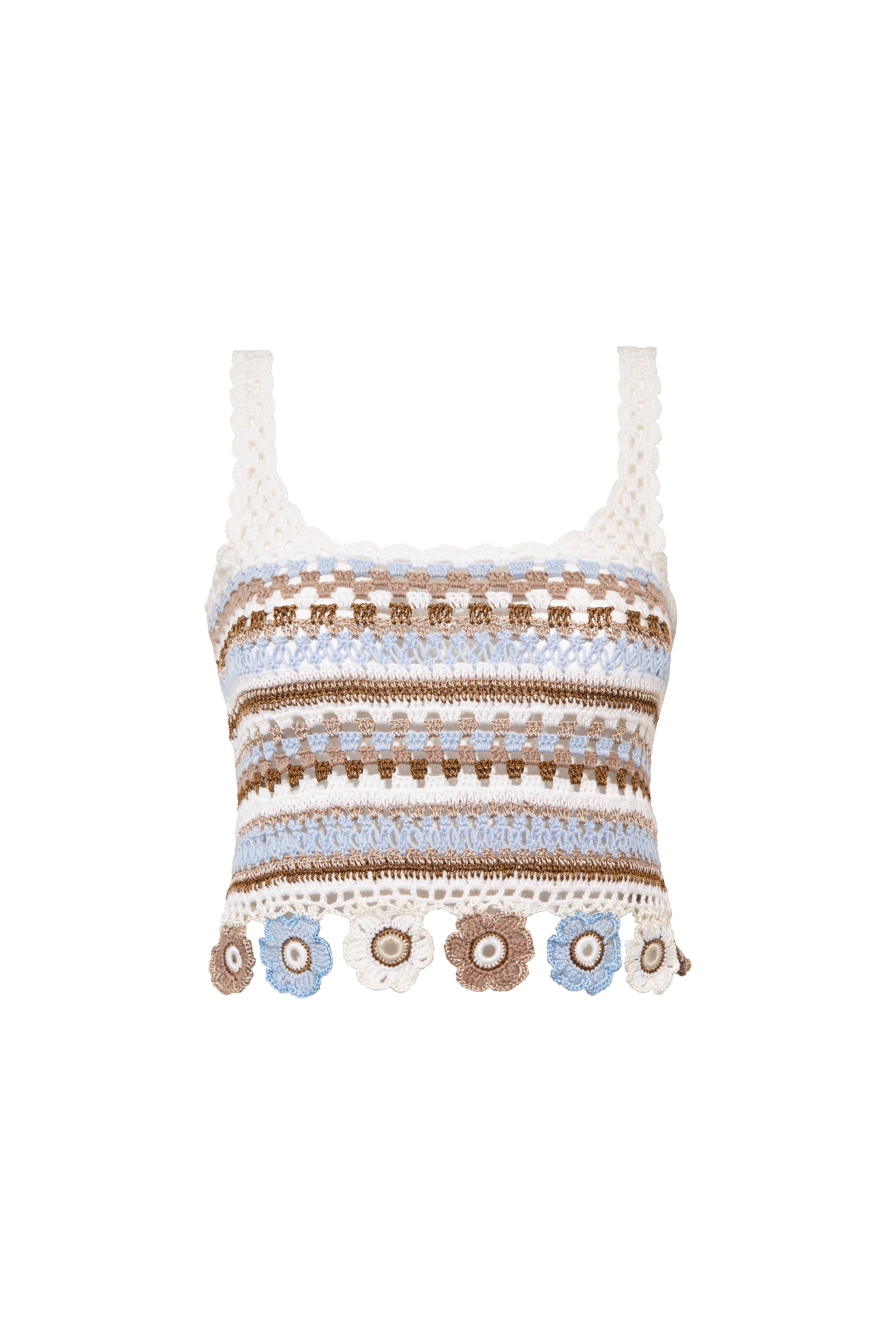 A playful handcrafted crochet halter top that merges artisanal charm with vibrant detailing. Featuring a classic neckline and crafted from colorful striped threads, it showcases a lively stripe motif enriched with rows of delicate floral accents at the hem. Perfect for pairing with matching bottoms or worn alone for a cheerful, statement summer look.