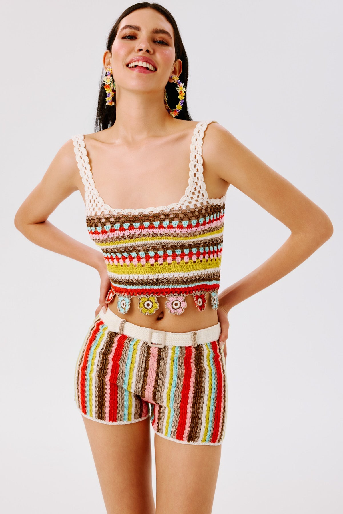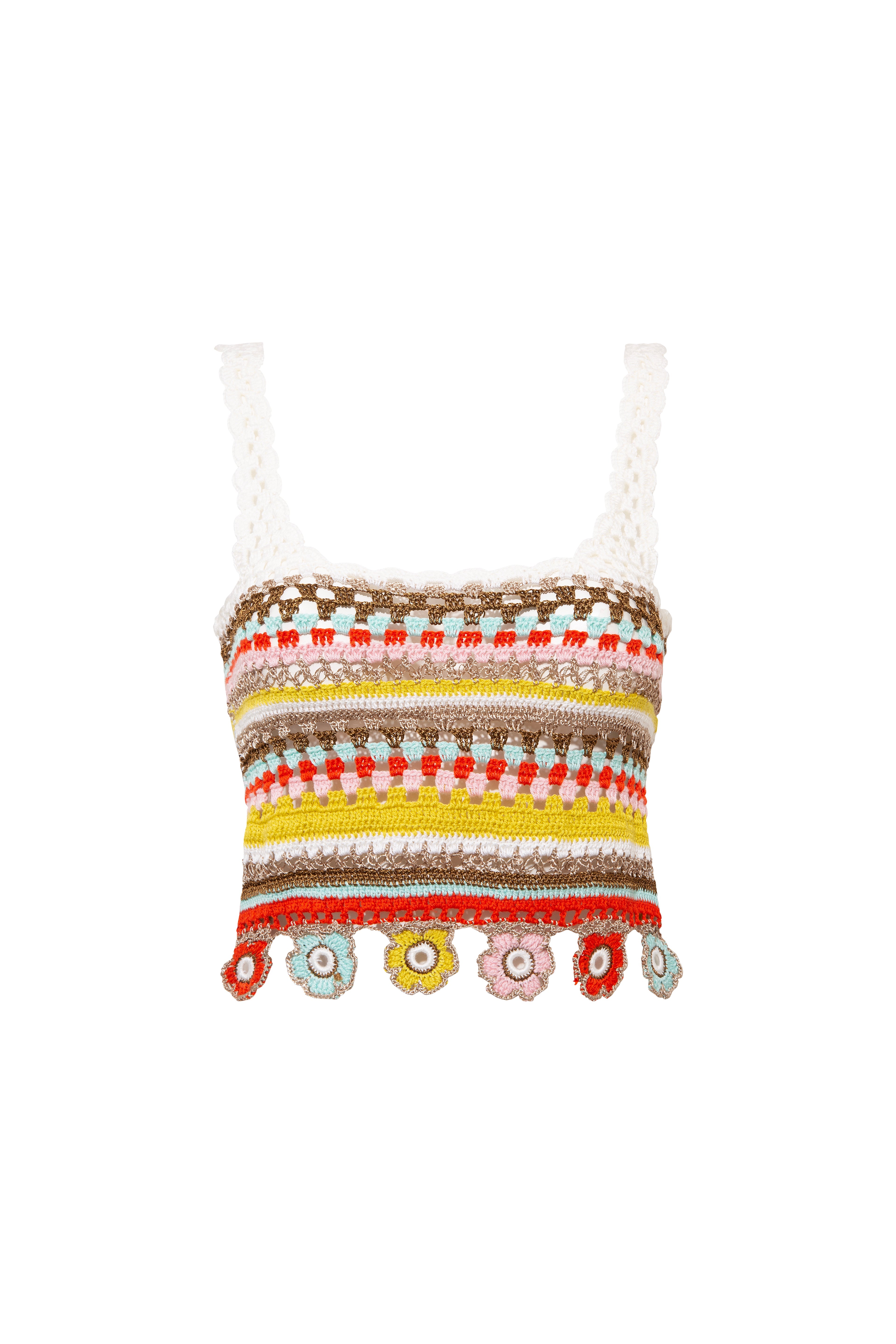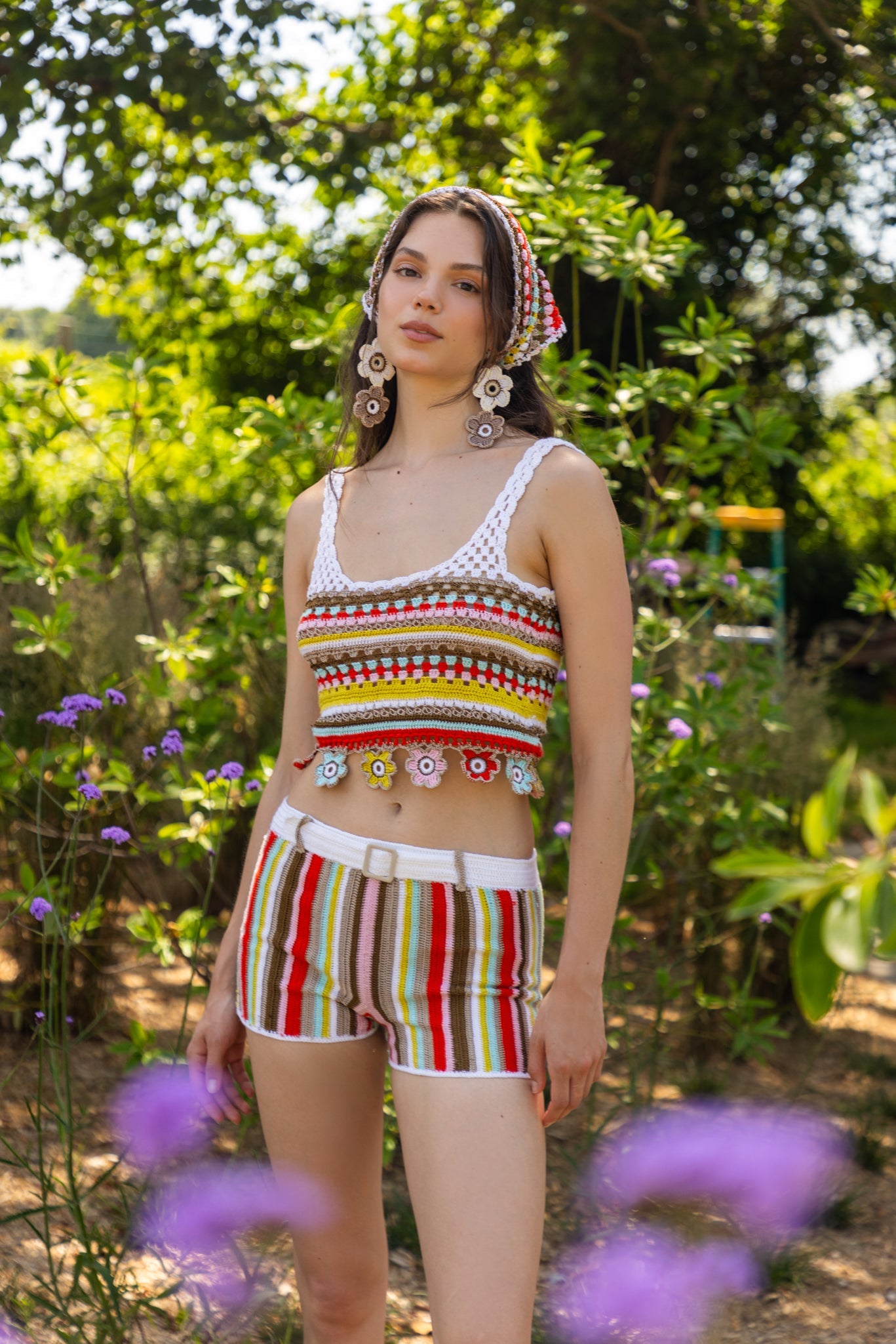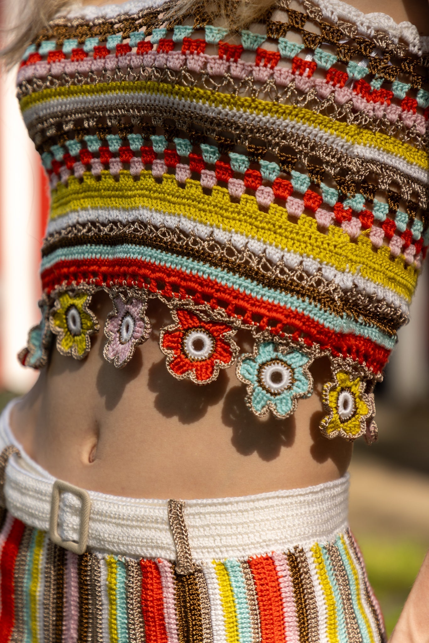 A playful handcrafted crochet halter top that merges artisanal charm with vibrant detailing. Featuring a classic neckline and crafted from colorful striped threads, it showcases a lively stripe motif enriched with rows of delicate floral accents at the hem. Perfect for pairing with matching bottoms or worn alone for a cheerful, statement summer look.