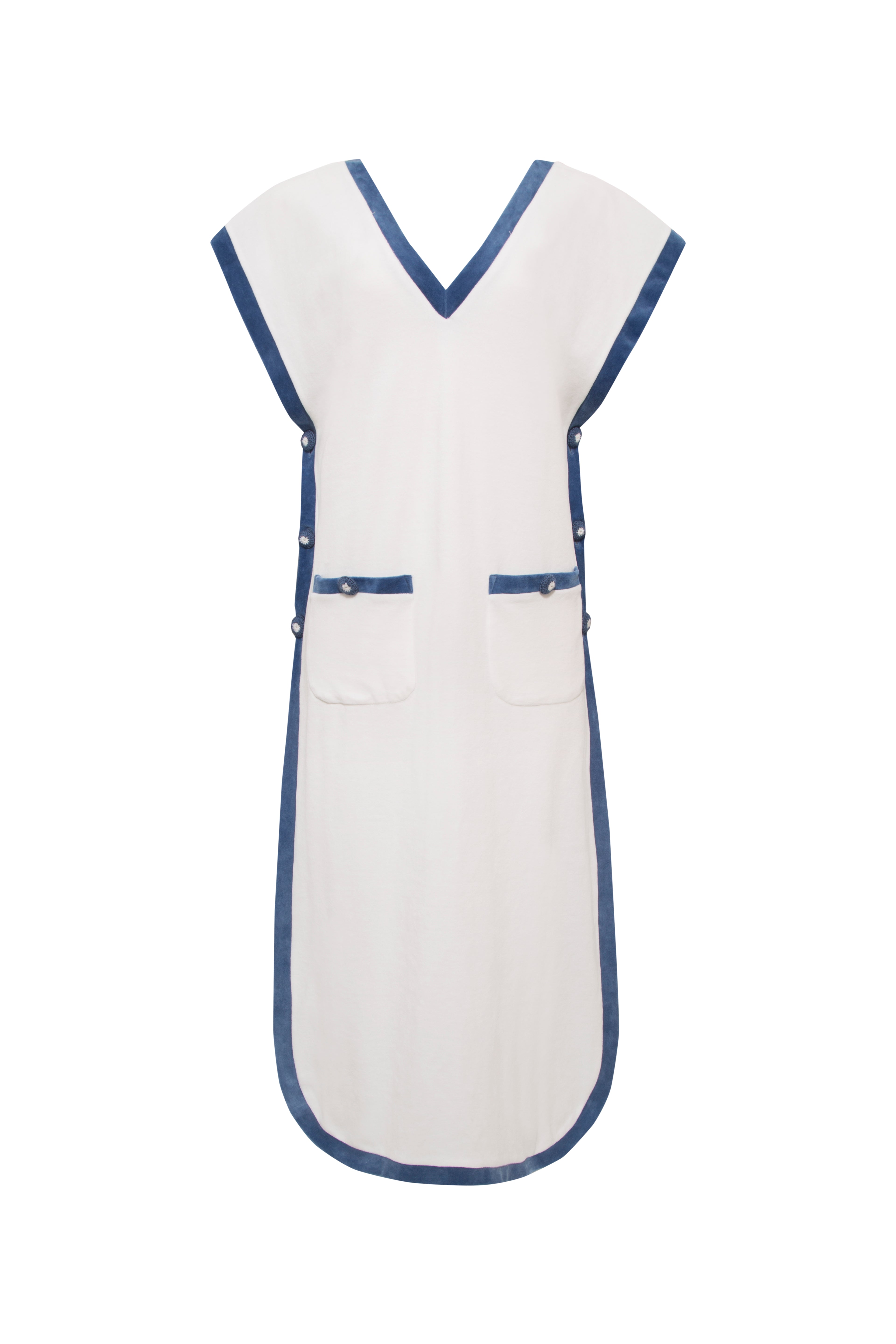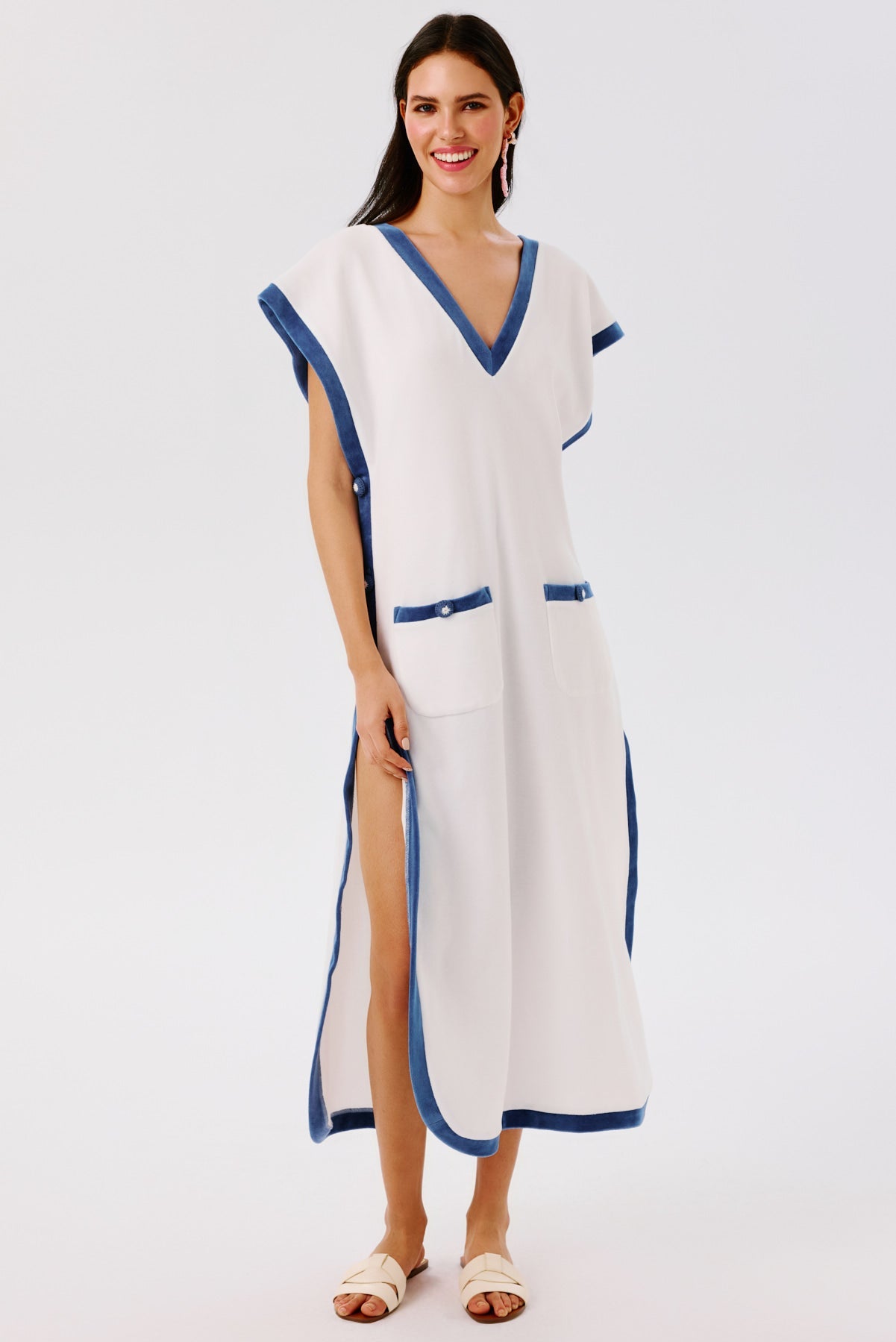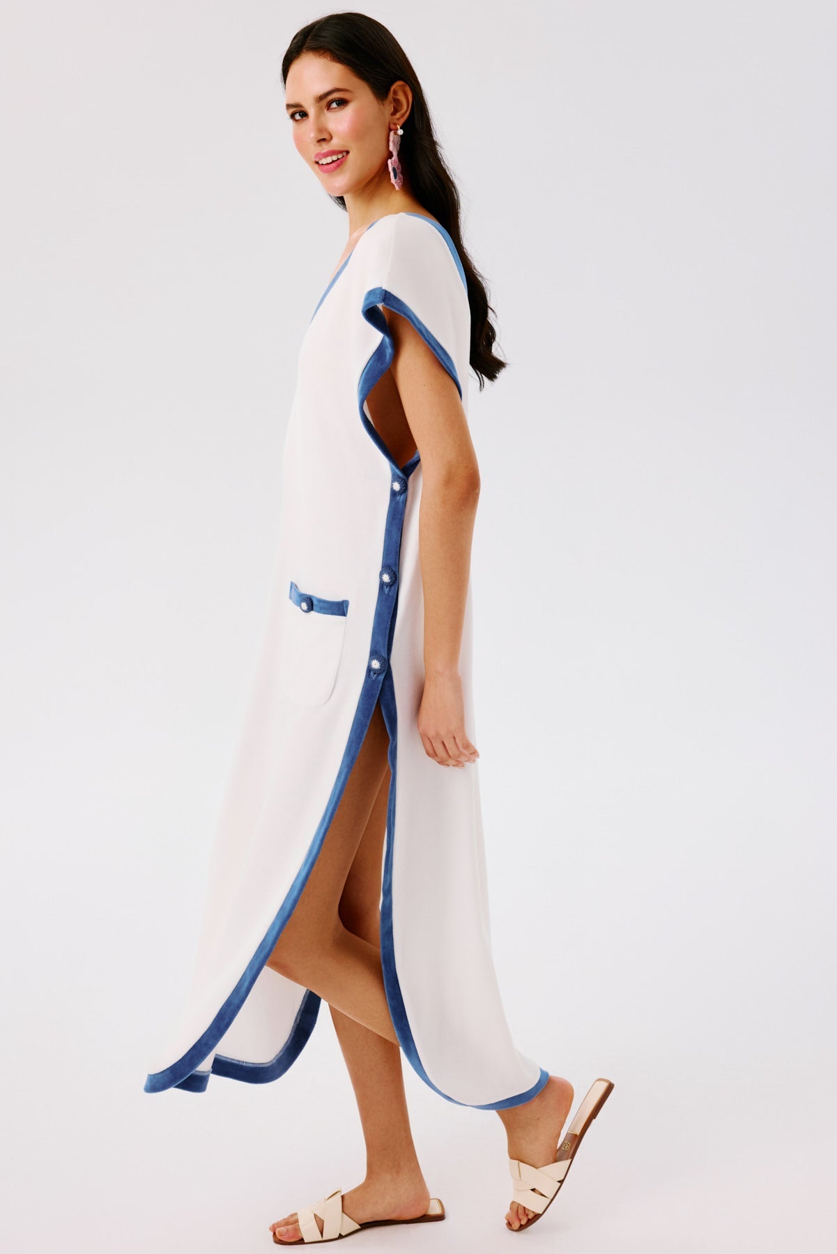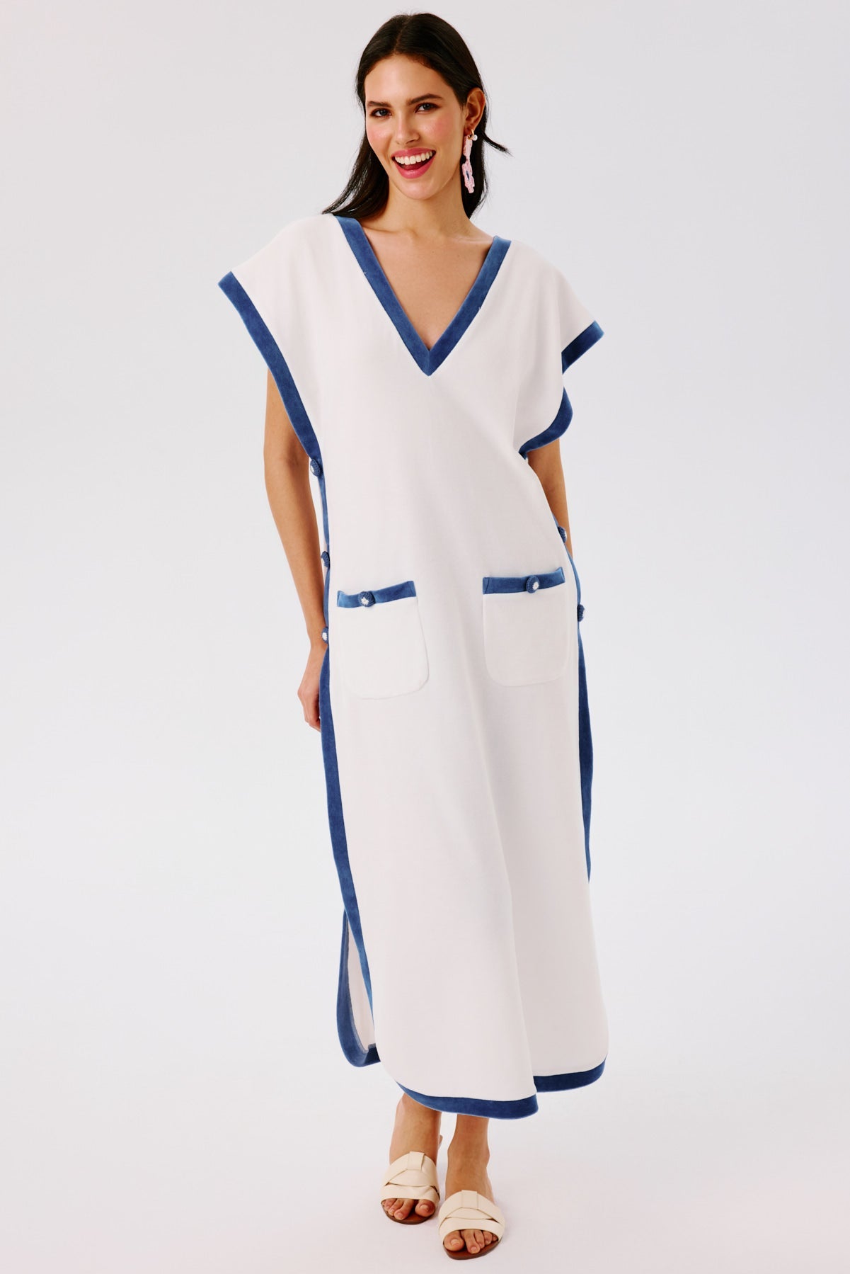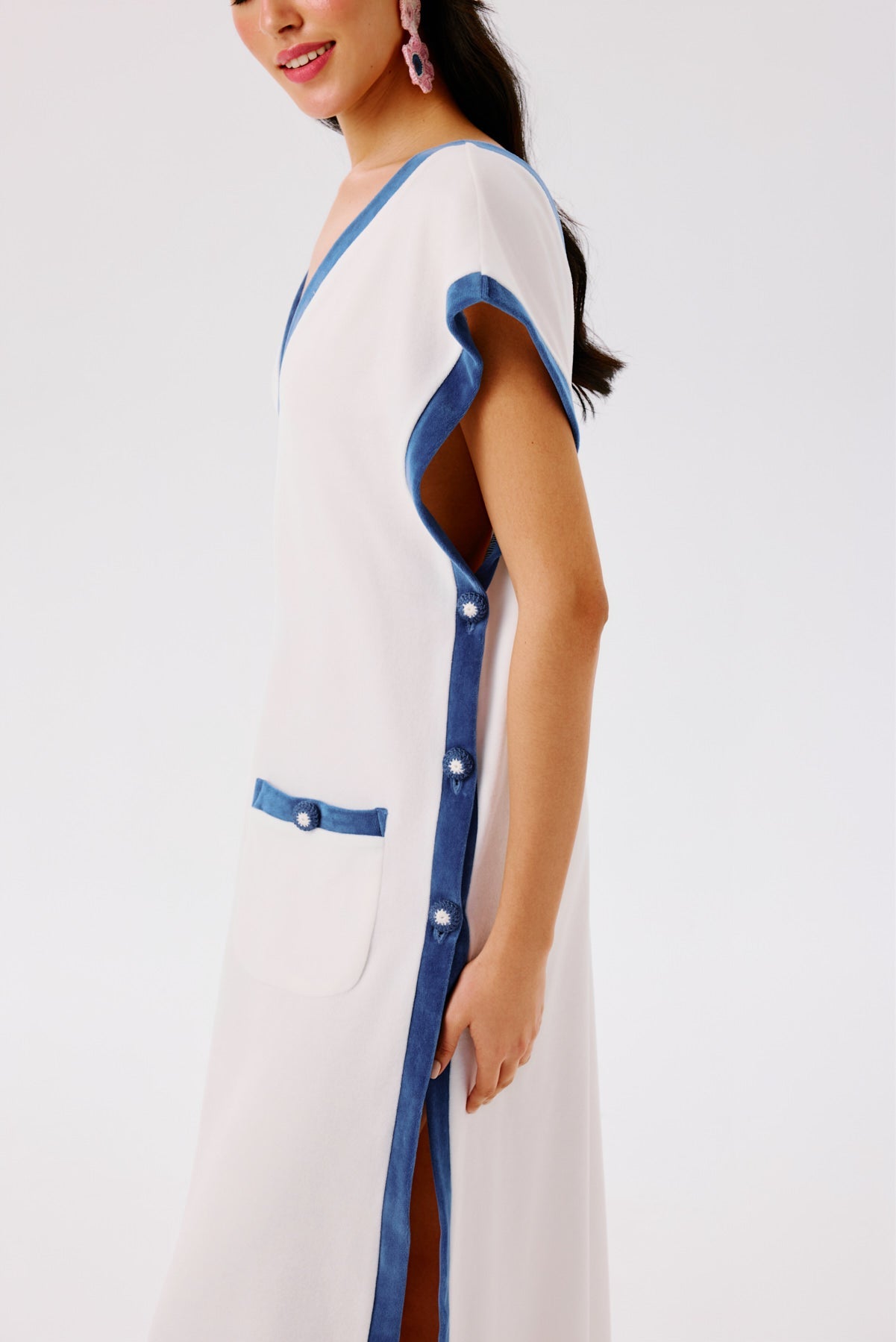 A luxurious velvet maxi caftan with a V-neckline, designed with contrasting bias trims for a timeless, elegant look. It fastens at the sides with hand-knitted buttons while leaving open panels for effortless movement.