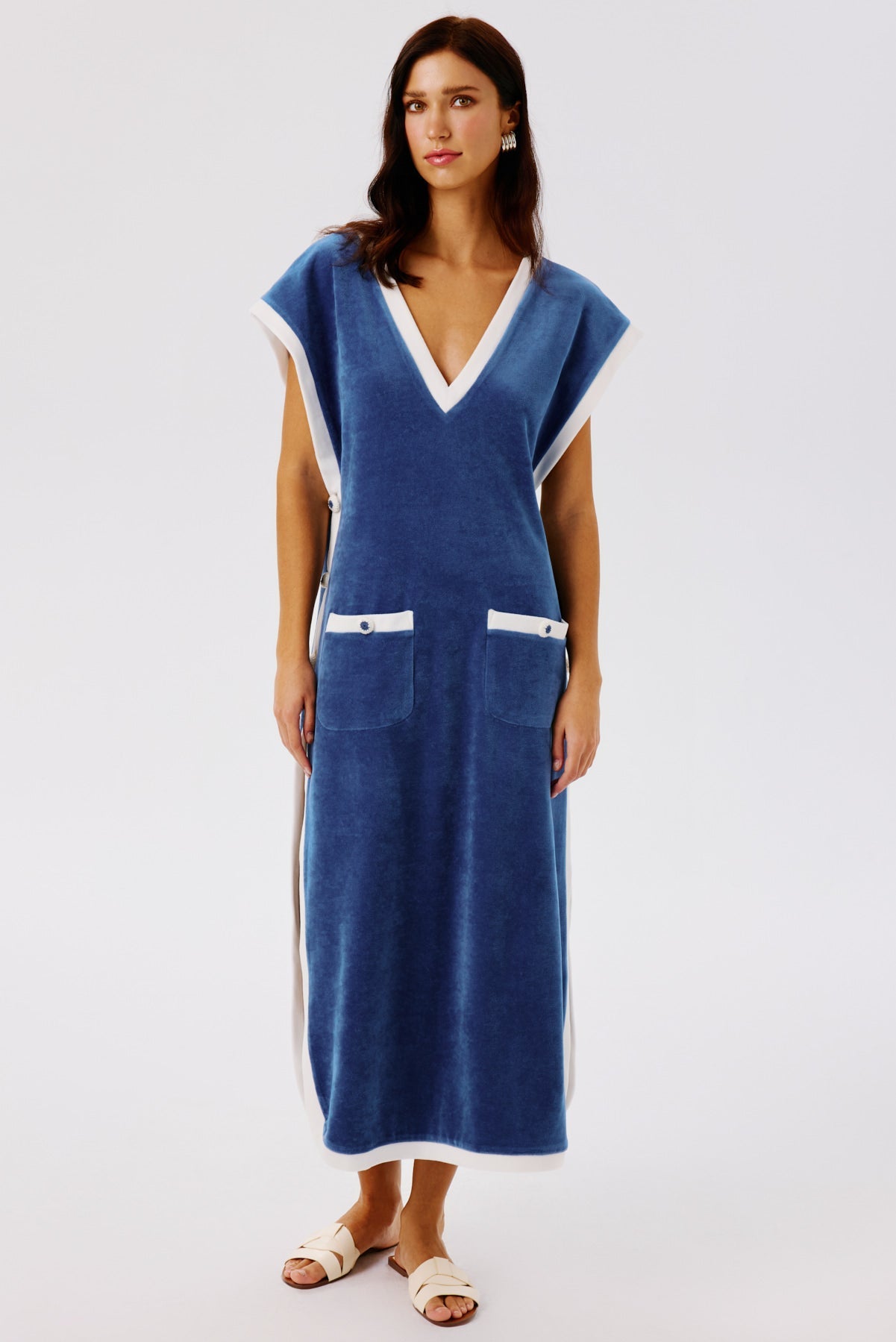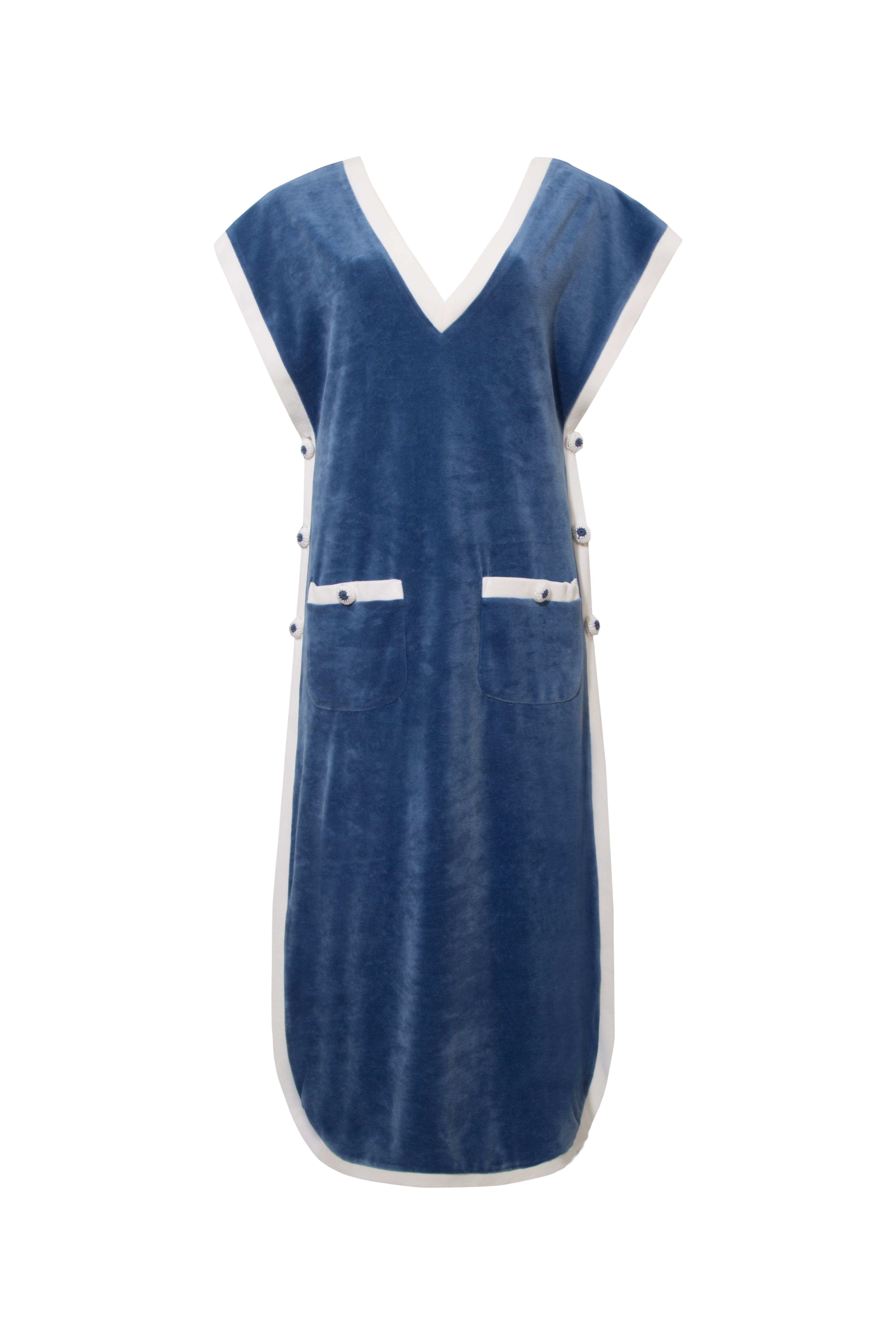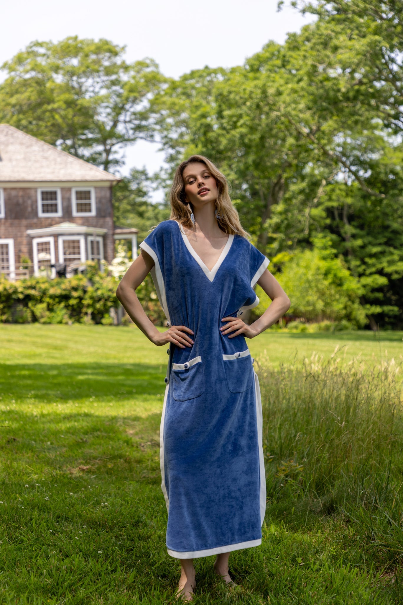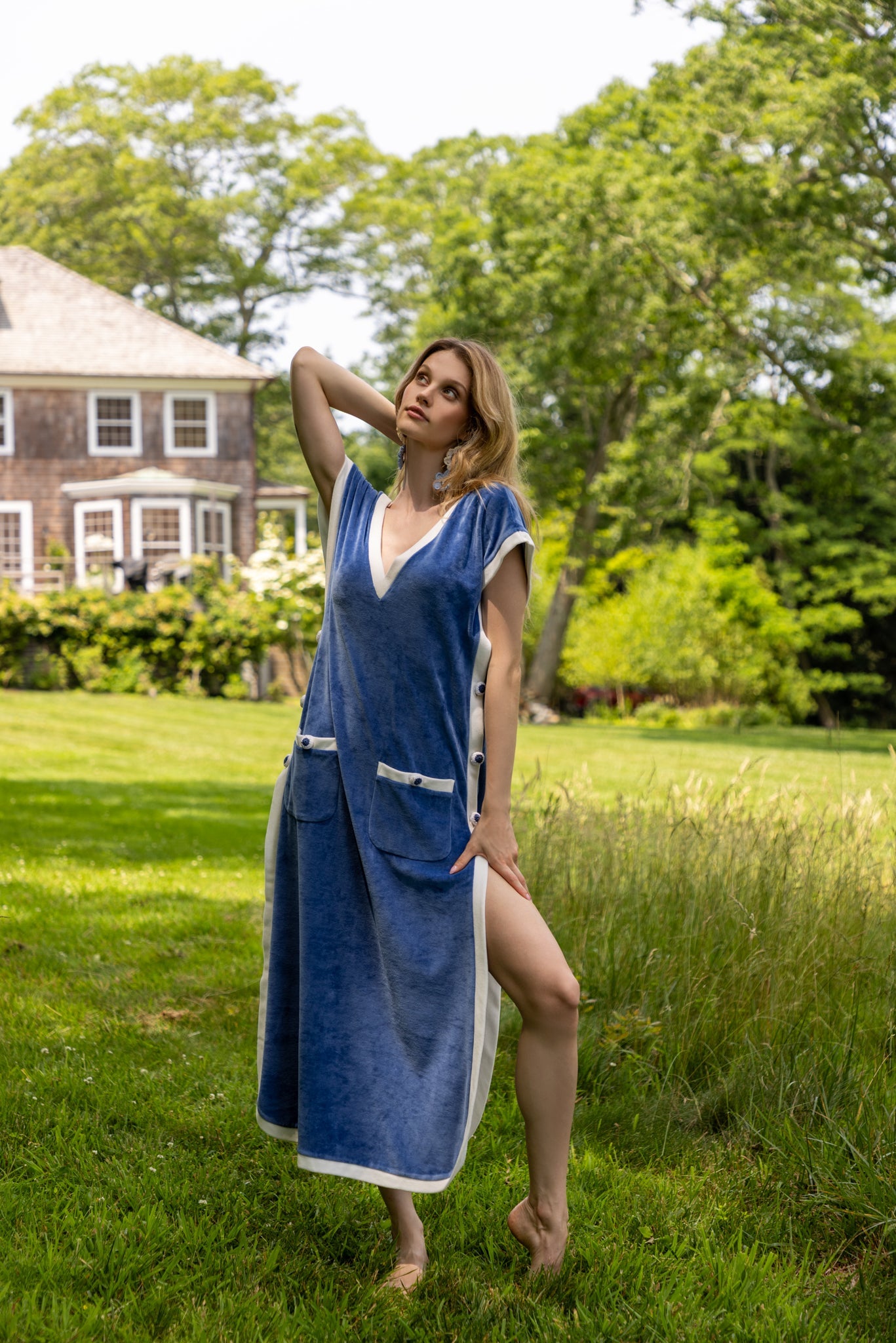 A luxurious velvet maxi caftan with a V-neckline, designed with contrasting bias trims for a timeless, elegant look. It fastens at the sides with hand-knitted buttons while leaving open panels for effortless movement.