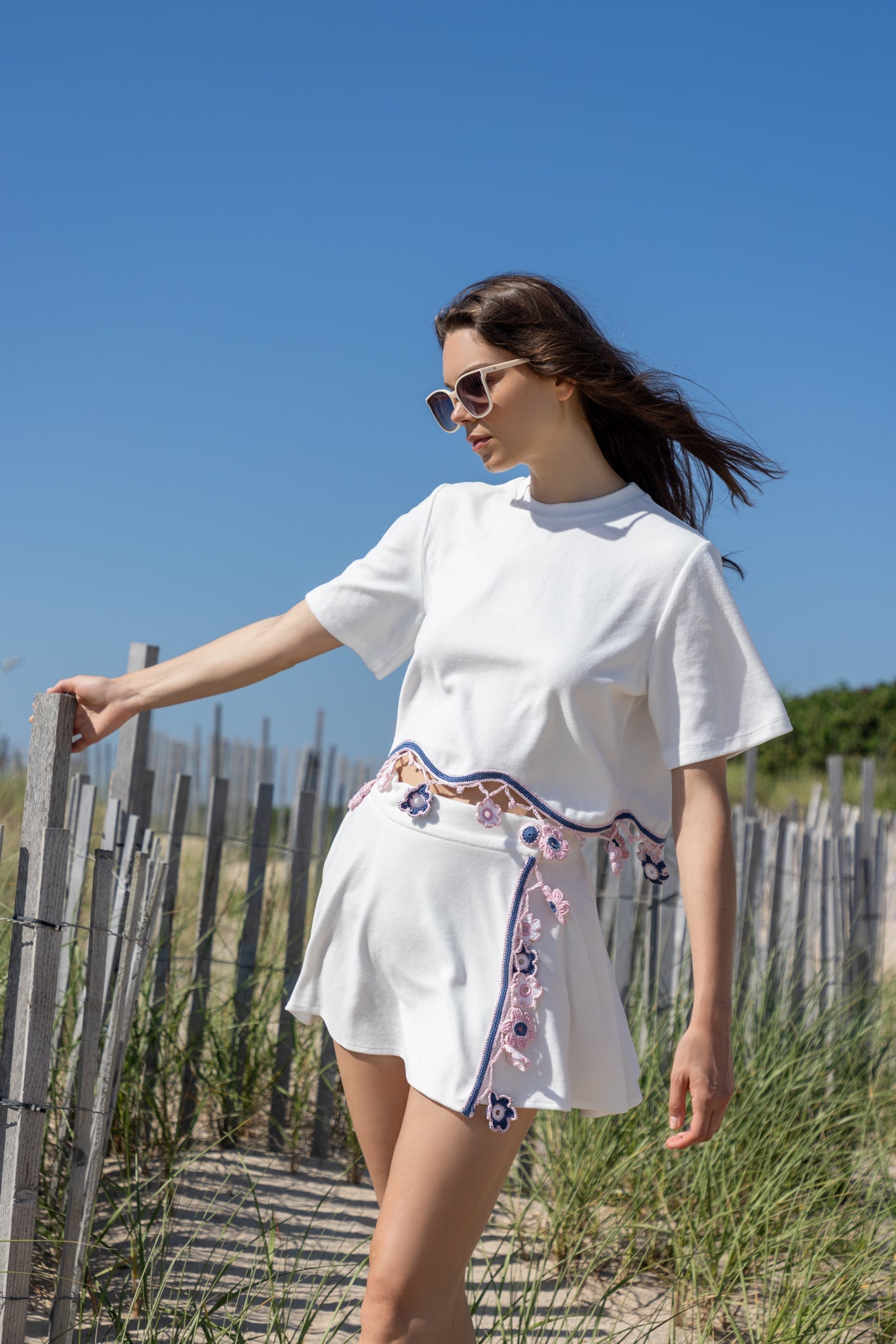 Our signature design, this wrap mini skirt blends playful movement with artisanal detailing. It fastens at the waist with a hand-knitted button closure and is adorned at the front with a delicate dangling floral motif accessory. Perfect for creating coordinated looks or styled individually for a chic summer statement.