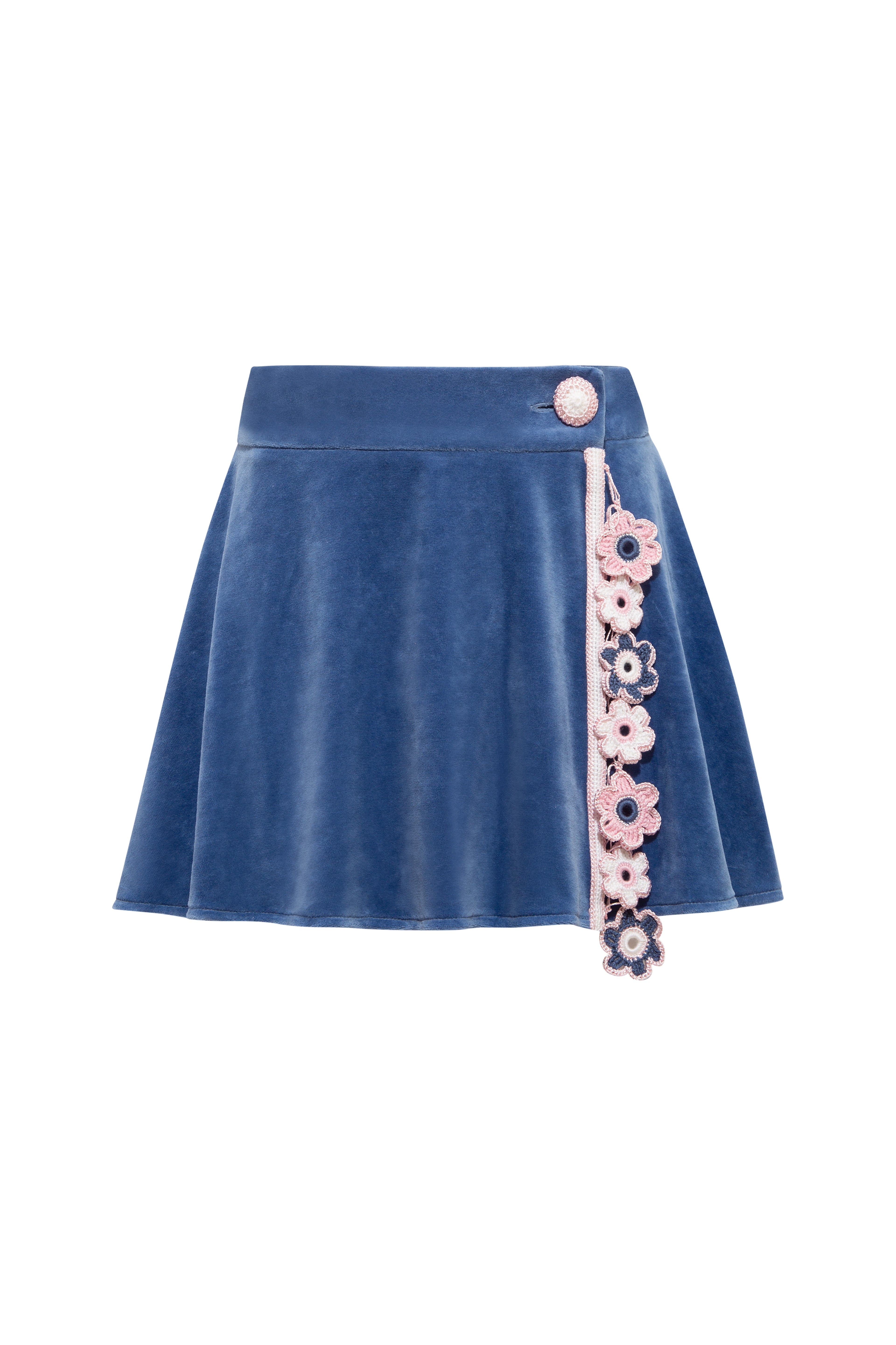Our signature design, this wrap mini skirt blends playful movement with artisanal detailing. It fastens at the waist with a hand-knitted button closure and is adorned at the front with a delicate dangling floral motif accessory. Perfect for creating coordinated looks or styled individually for a chic summer statement.