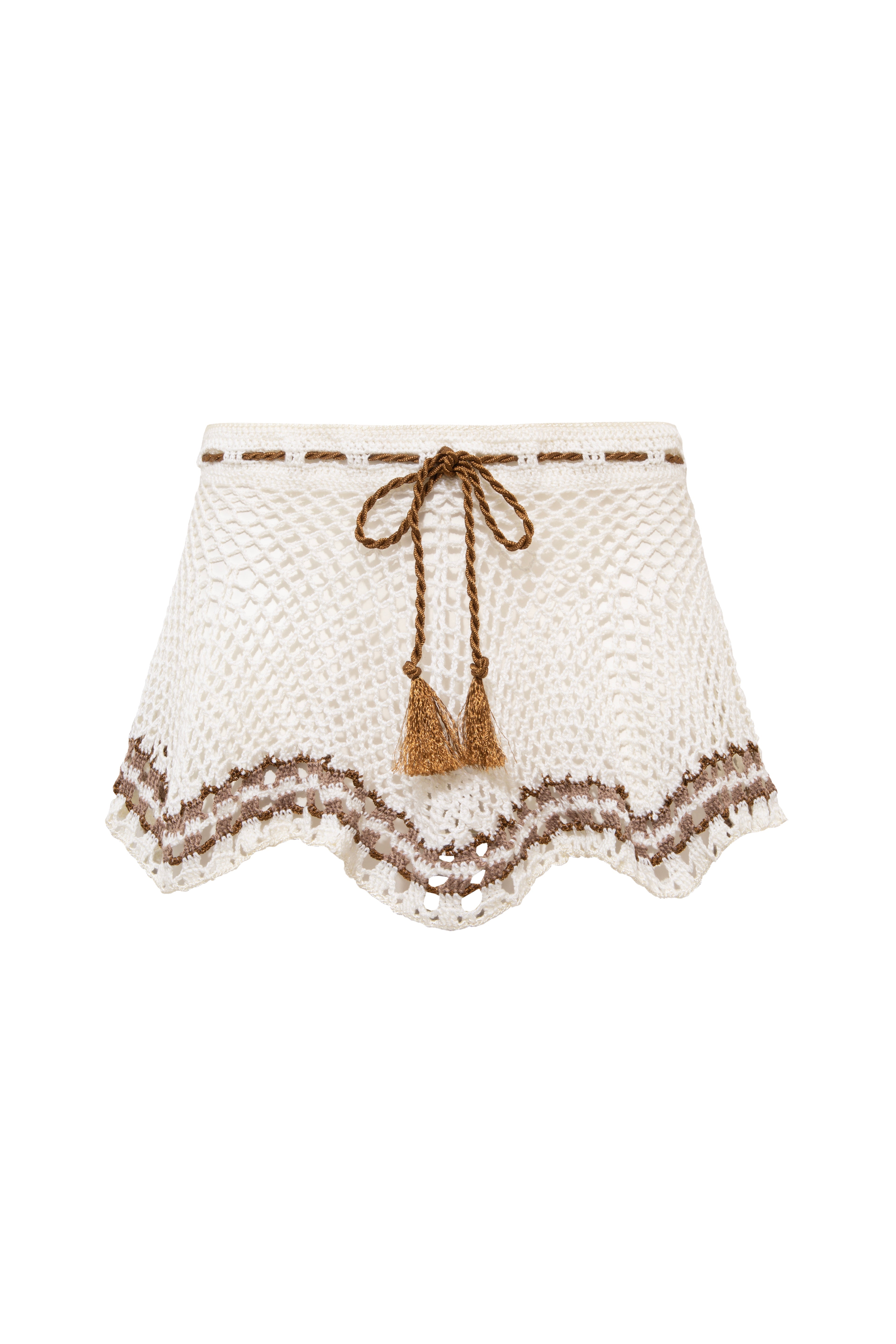 A hand-crocheted mini skirt that radiates artisanal elegance with playful detailing. Featuring a braided tie at the waist, it sits beautifully with a flattering fit. The hemline forms delicate triangular edges adorned with a subtle linear motif, adding a unique handcrafted touch. Perfectly styled with its matching top or worn separately, this piece transitions effortlessly from day to night.