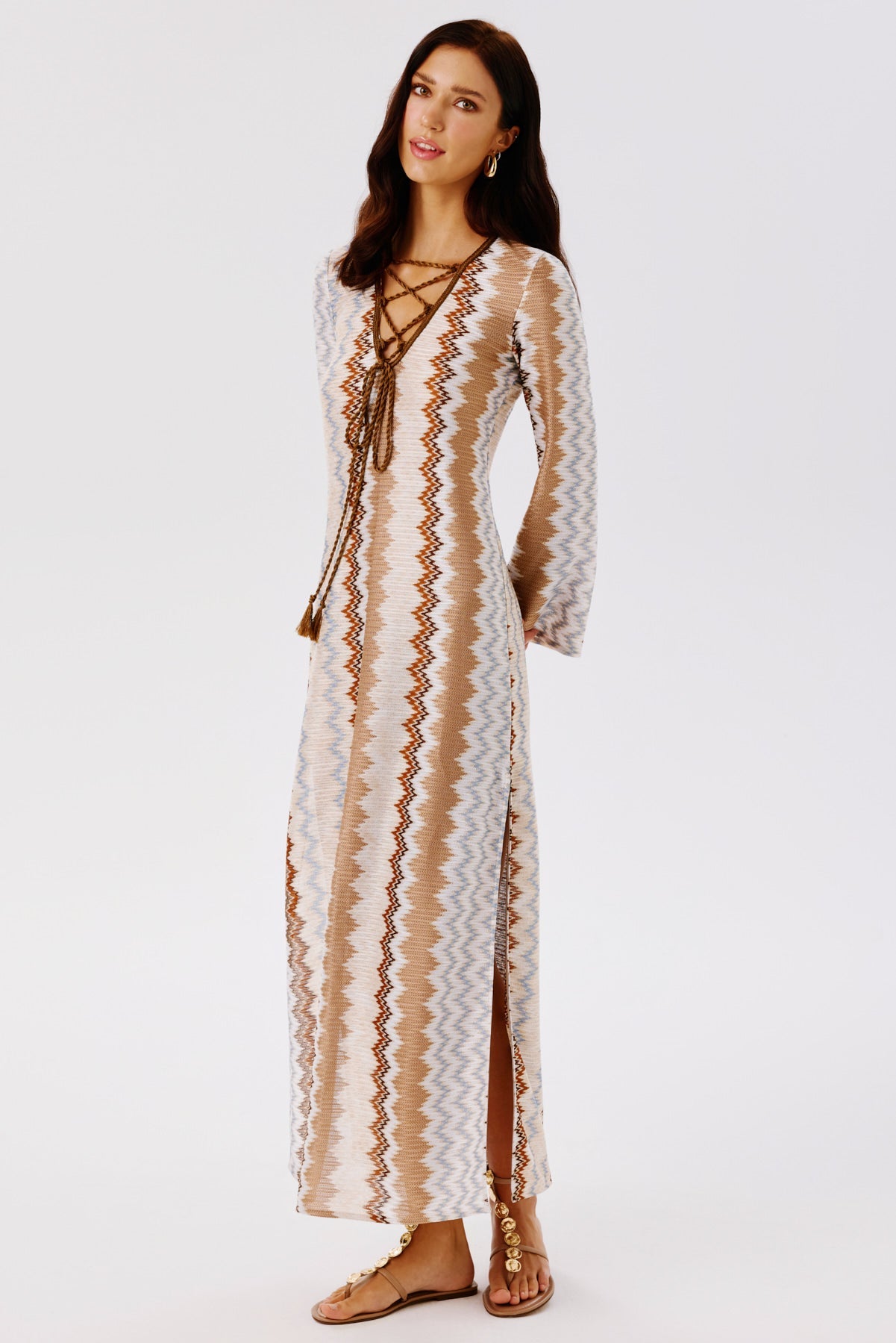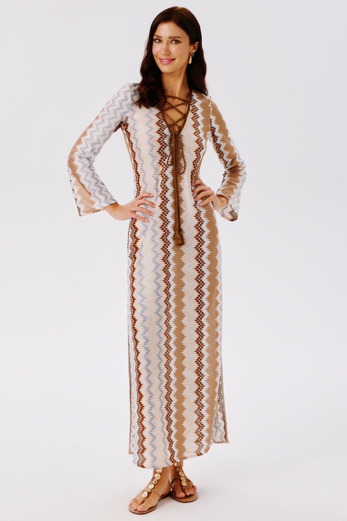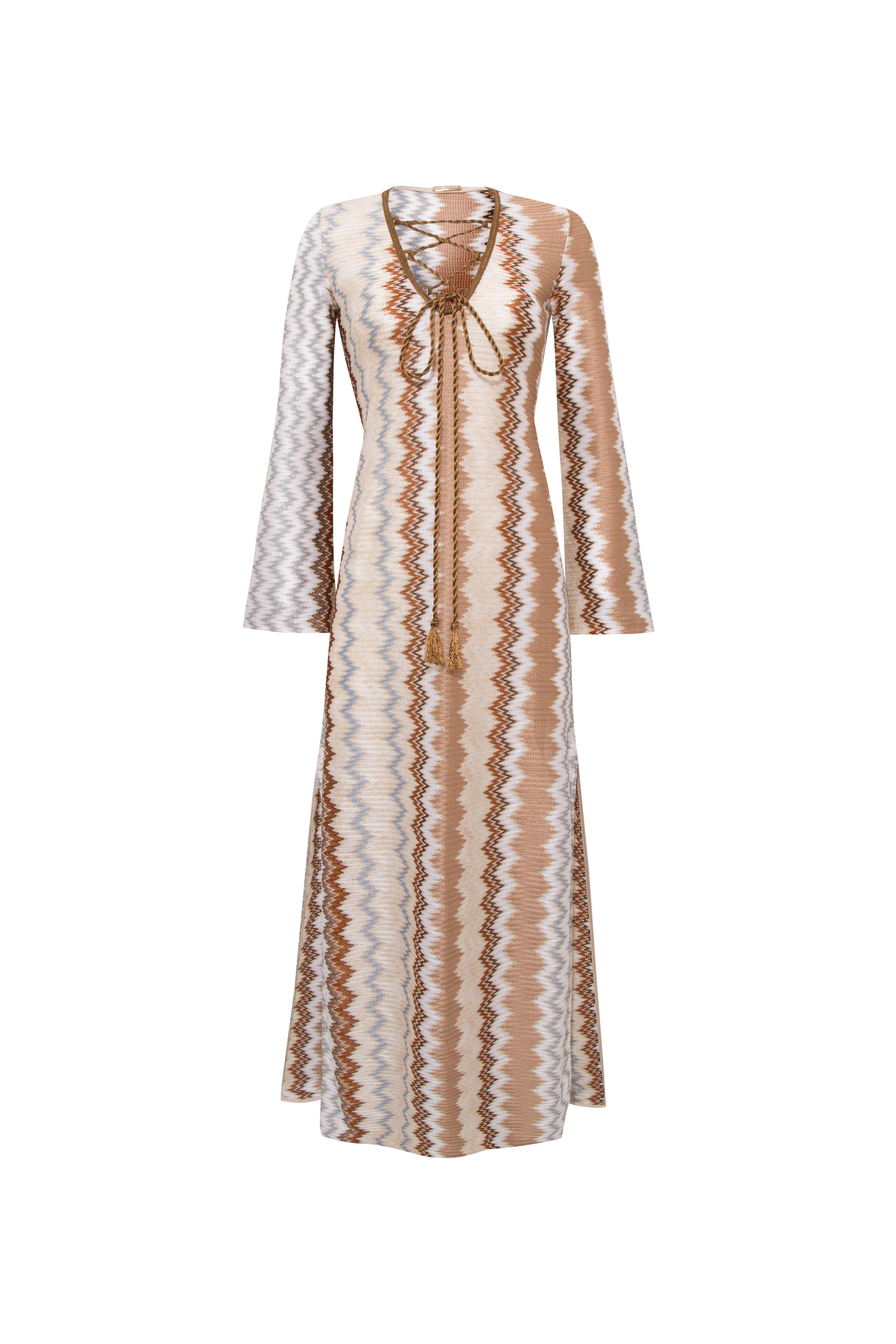 A flowing maxi caftan dress that embodies effortless summer elegance. Designed with a V-neckline and hand-knitted twisted tassel ties that cross at the front, it features side slits for added movement. Perfect for seaside moments or elevated daytime styling.