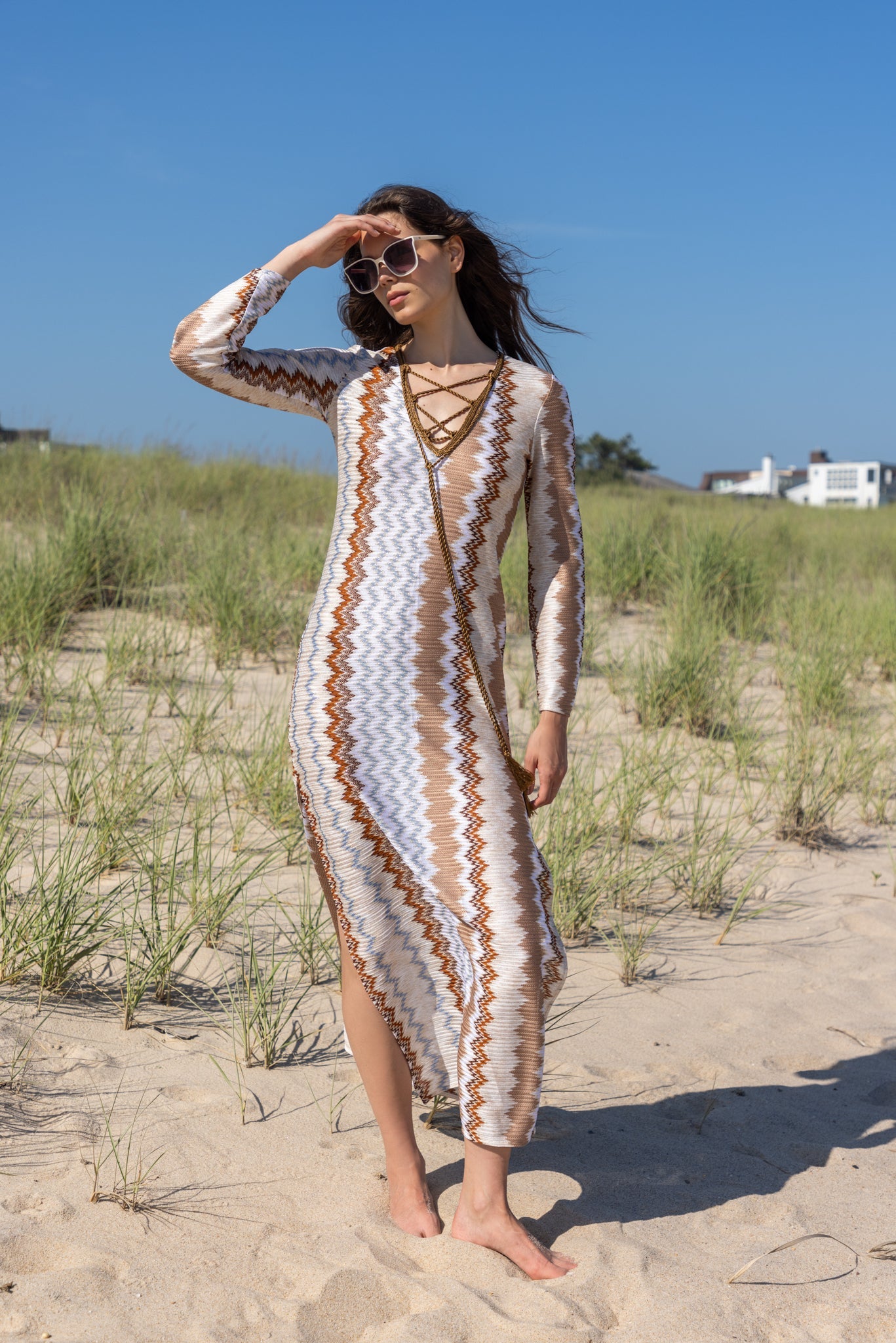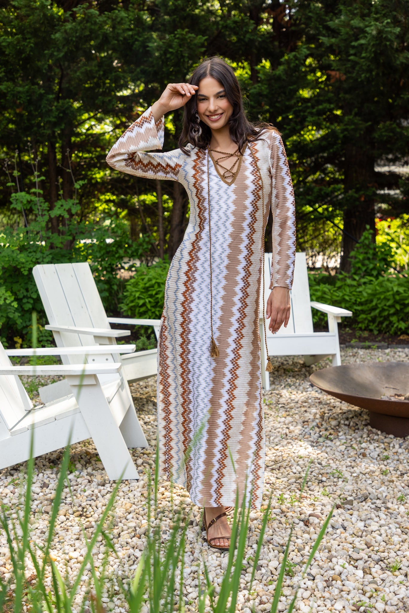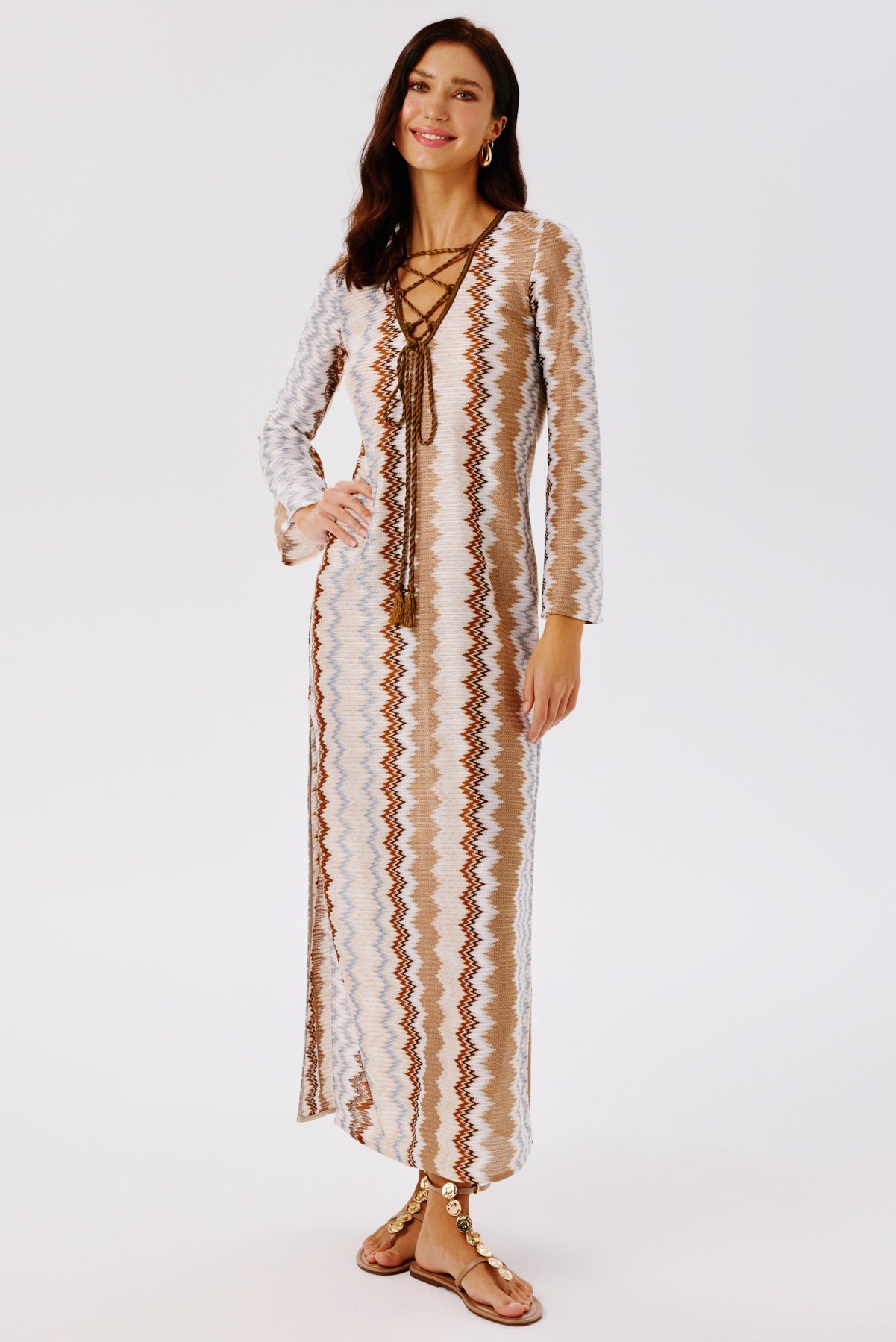 A flowing maxi caftan dress that embodies effortless summer elegance. Designed with a V-neckline and hand-knitted twisted tassel ties that cross at the front, it features side slits for added movement. Perfect for seaside moments or elevated daytime styling.