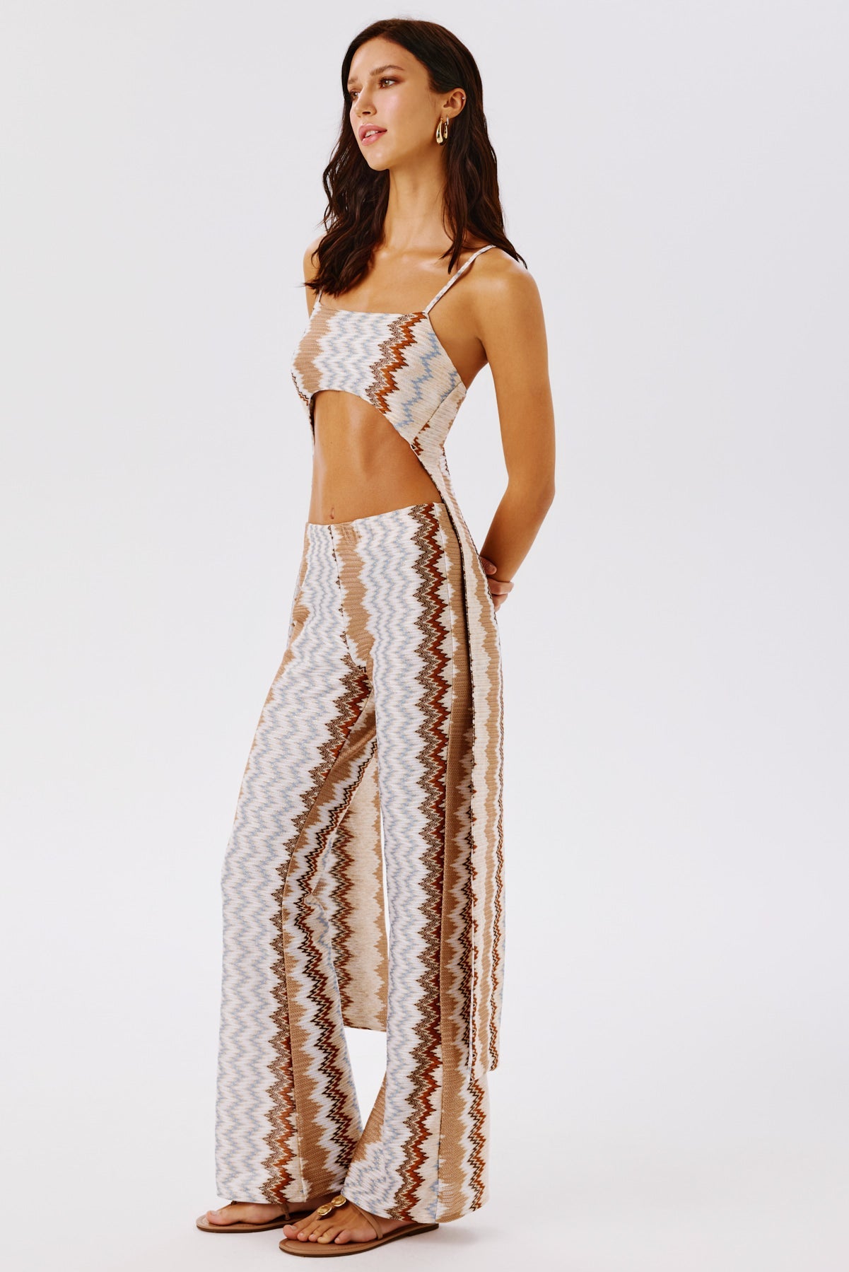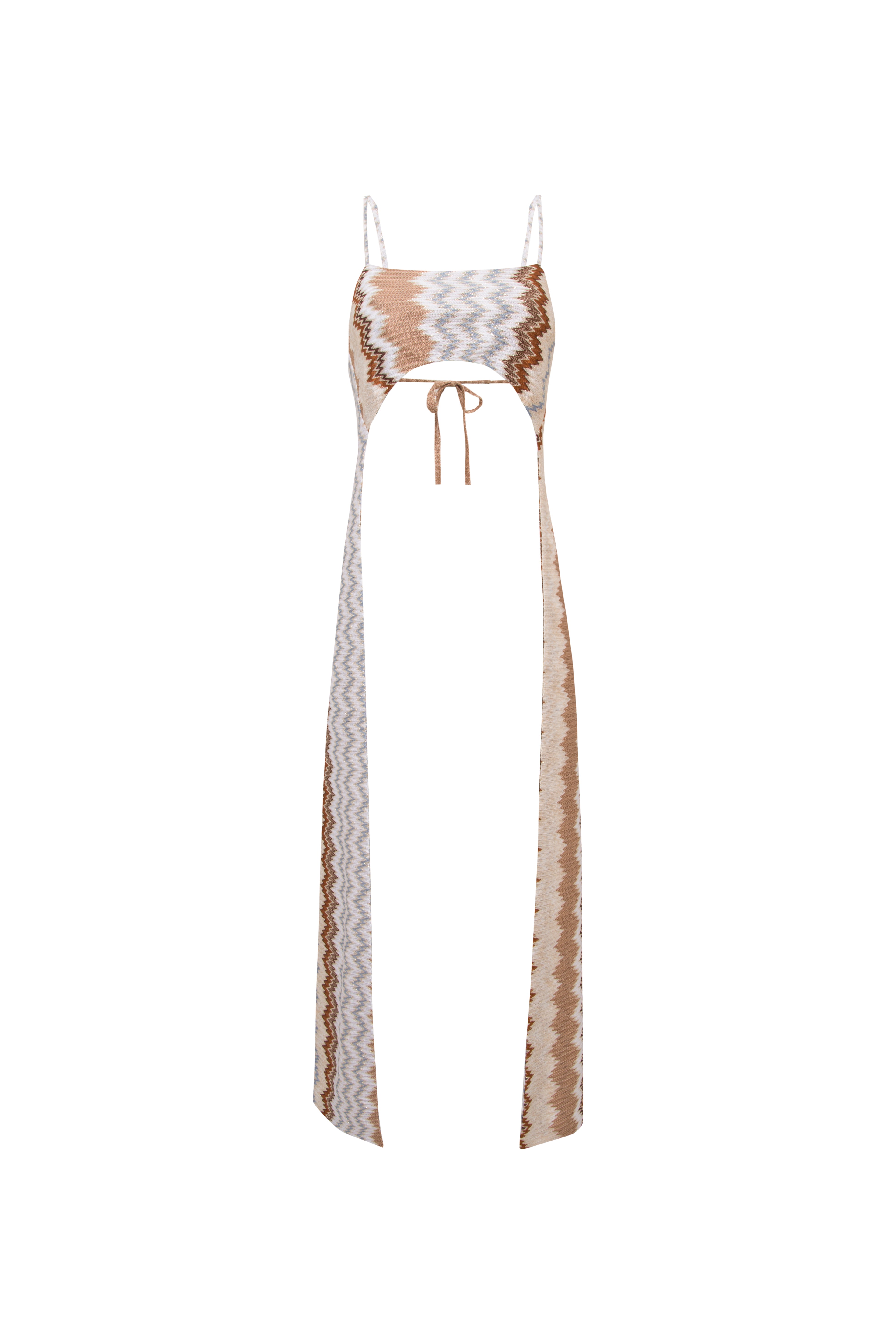 Striking strappy top with a modern, asymmetric silhouette. Designed with an open back and adjustable tie fastening, its super-cropped front extends into elongated sides, creating a sculptural, contemporary look. Versatile and bold, it transitions effortlessly from day to night styling.