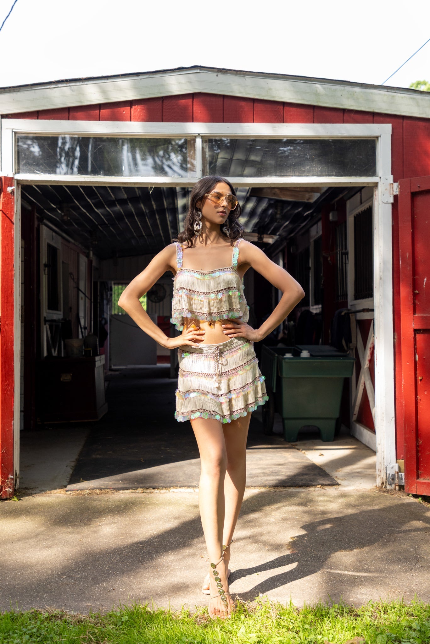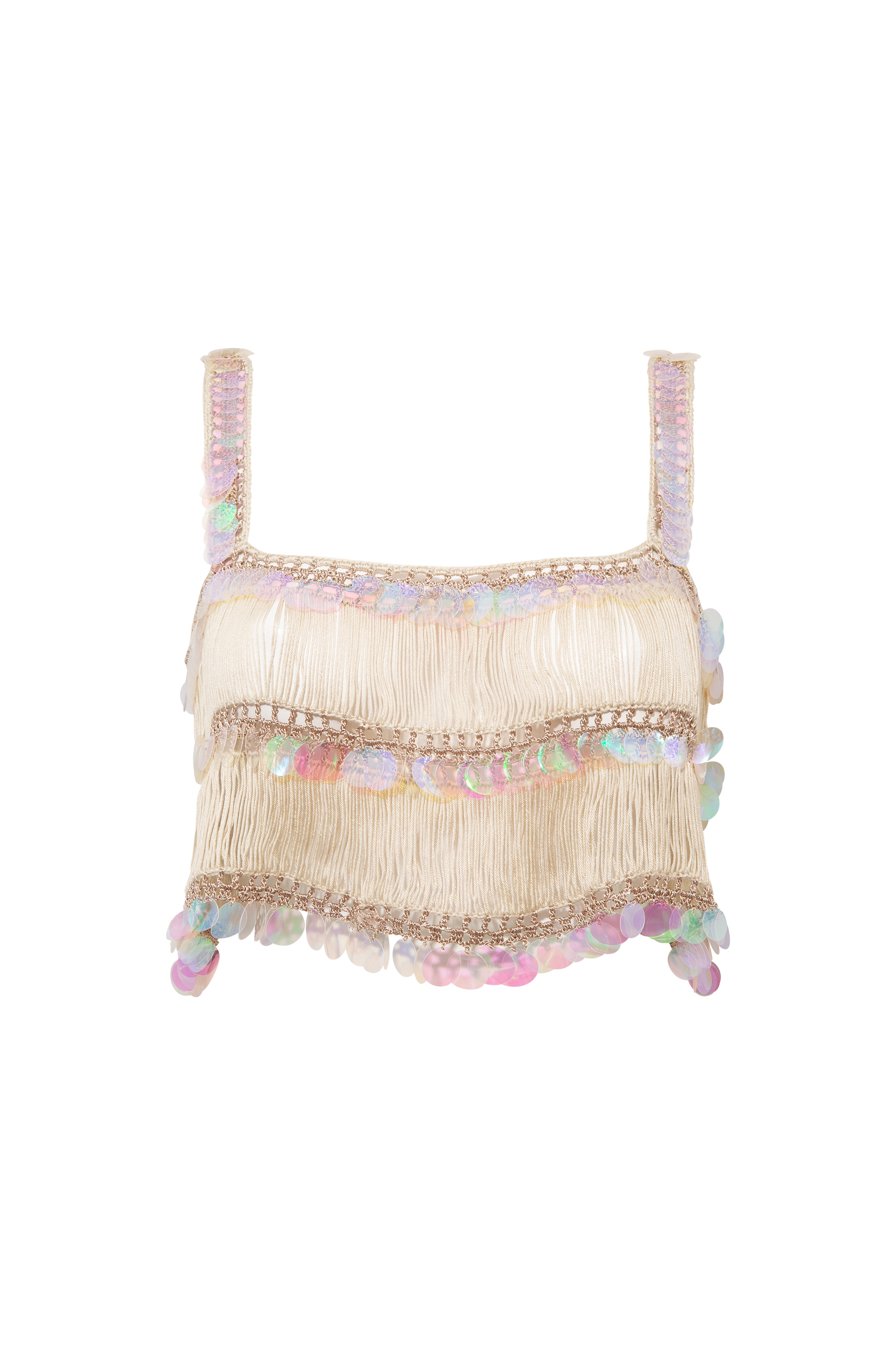 A charming handcrafted crochet square-neck top, designed to complement a variety of looks with effortless elegance. Featuring a subtle sequin-accented motif detailing, it brings a playful sparkle to a timeless silhouette. Light and breathable, this versatile piece can be styled alone or paired with matching skirts for a coordinated set that shines day or night.