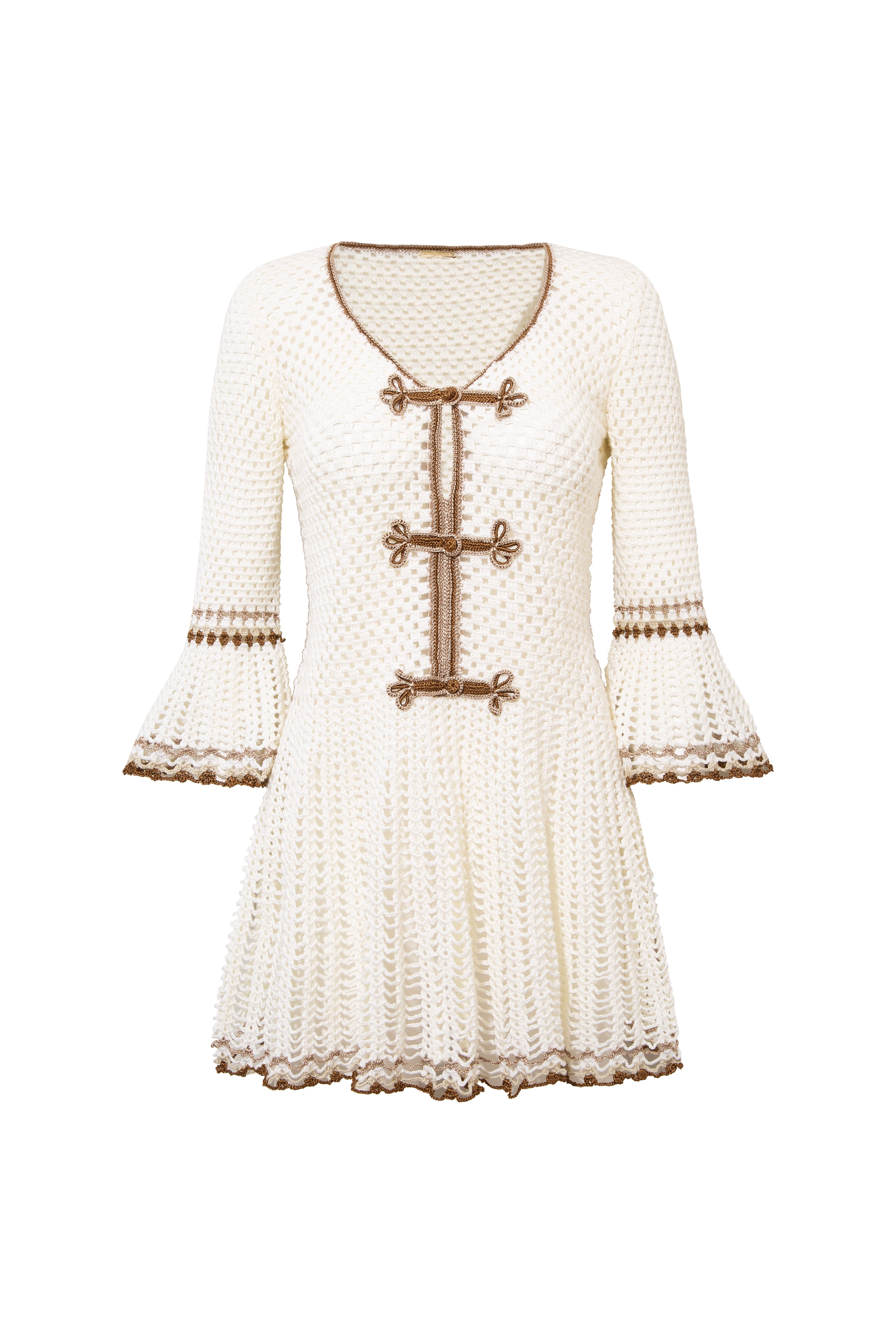 A captivating handcrafted crochet mini dress that merges artisanal elegance with feminine charm. Featuring a flattering V-neckline and unique crochet epaulet-inspired detailing on the bodice, it gently hugs the waist before flowing into a graceful flared silhouette. The sleeves fit softly above the elbows before opening into delicate bell shapes, adding romantic movement to the design. Adorned with intricate corded motifs along the hem and panels, this piece embodies timeless craftsmanship and effortless style—perfect for making a statement day or night.