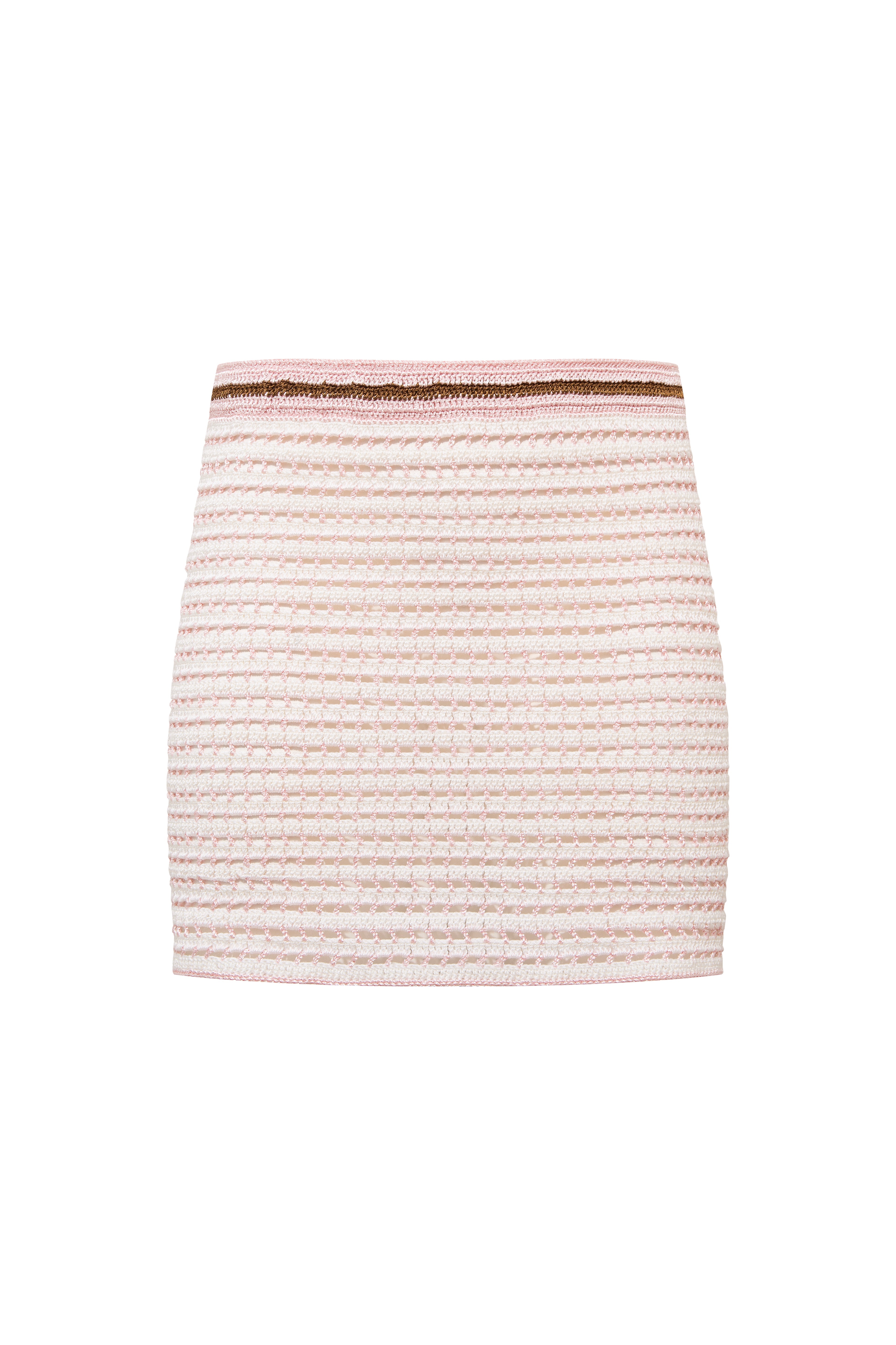 A hand-crocheted mini skirt crafted with meticulous attention to detail. Featuring a unique box motif that adds artisanal charm, it offers a flattering fit with an elasticized waist for comfort. Perfect for pairing with coordinated tops or styling independently for a chic, versatile look.