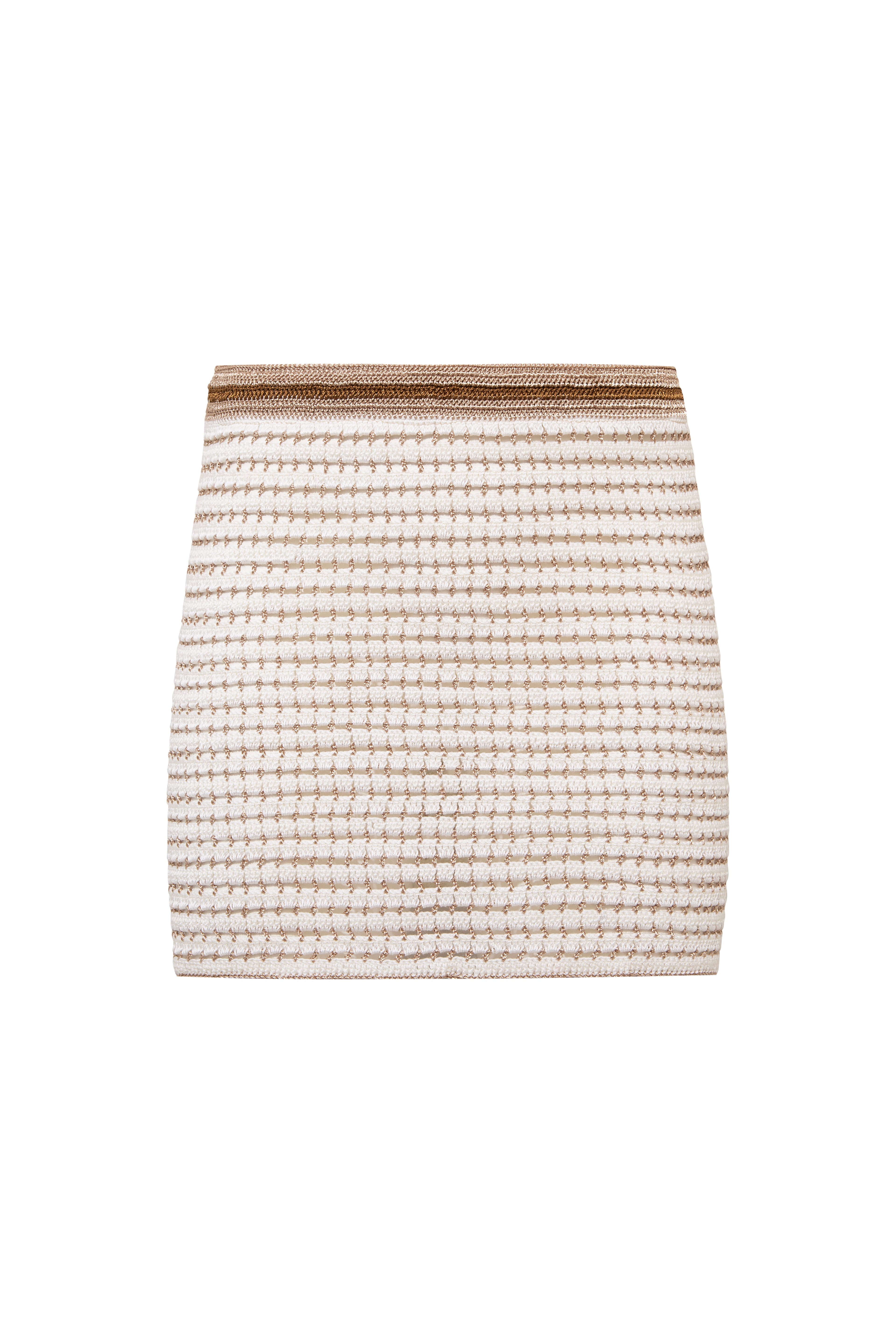 A hand-crocheted mini skirt crafted with meticulous attention to detail. Featuring a unique box motif that adds artisanal charm, it offers a flattering fit with an elasticized waist for comfort. Perfect for pairing with coordinated tops or styling independently for a chic, versatile look.